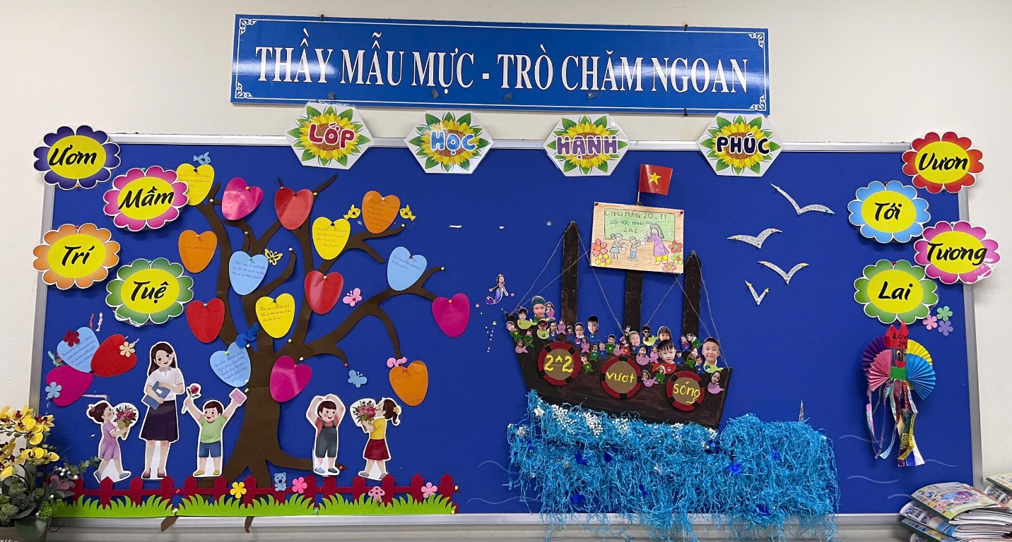 Lớp 2A2 đã thiết kế góc học tập sáng tạo với câu slogan “Ươm mầm trí tuệ - Vươn tới tương lai”. Góc sáng tạo nổi bật với hai hình ảnh: cô và trò đứng dưới bóng cây đầy quả ngọt, trái chín - đại diện cho ý nghĩa “Ươm mầm trí tuệ”; hình ảnh chiếc thuyền 2A2 vượt sóng với đoàn thuỷ thủ nhí cùng cô giáo - đại diện cho ý nghĩa “Vươn tới tương lai”. Sự sáng tạo của cô và trò lớp 2A2 đã giành giải Nhì trong hội thi.