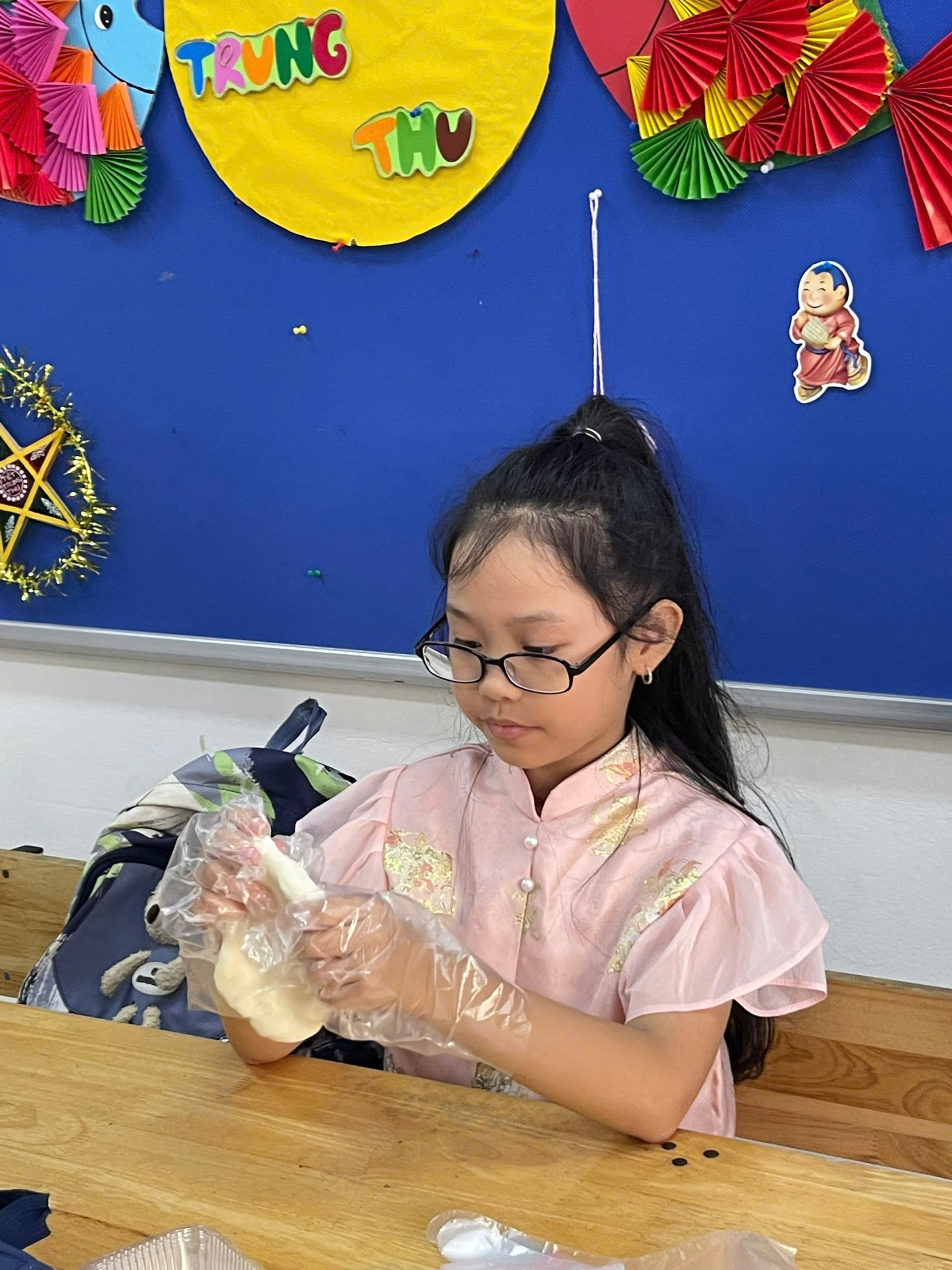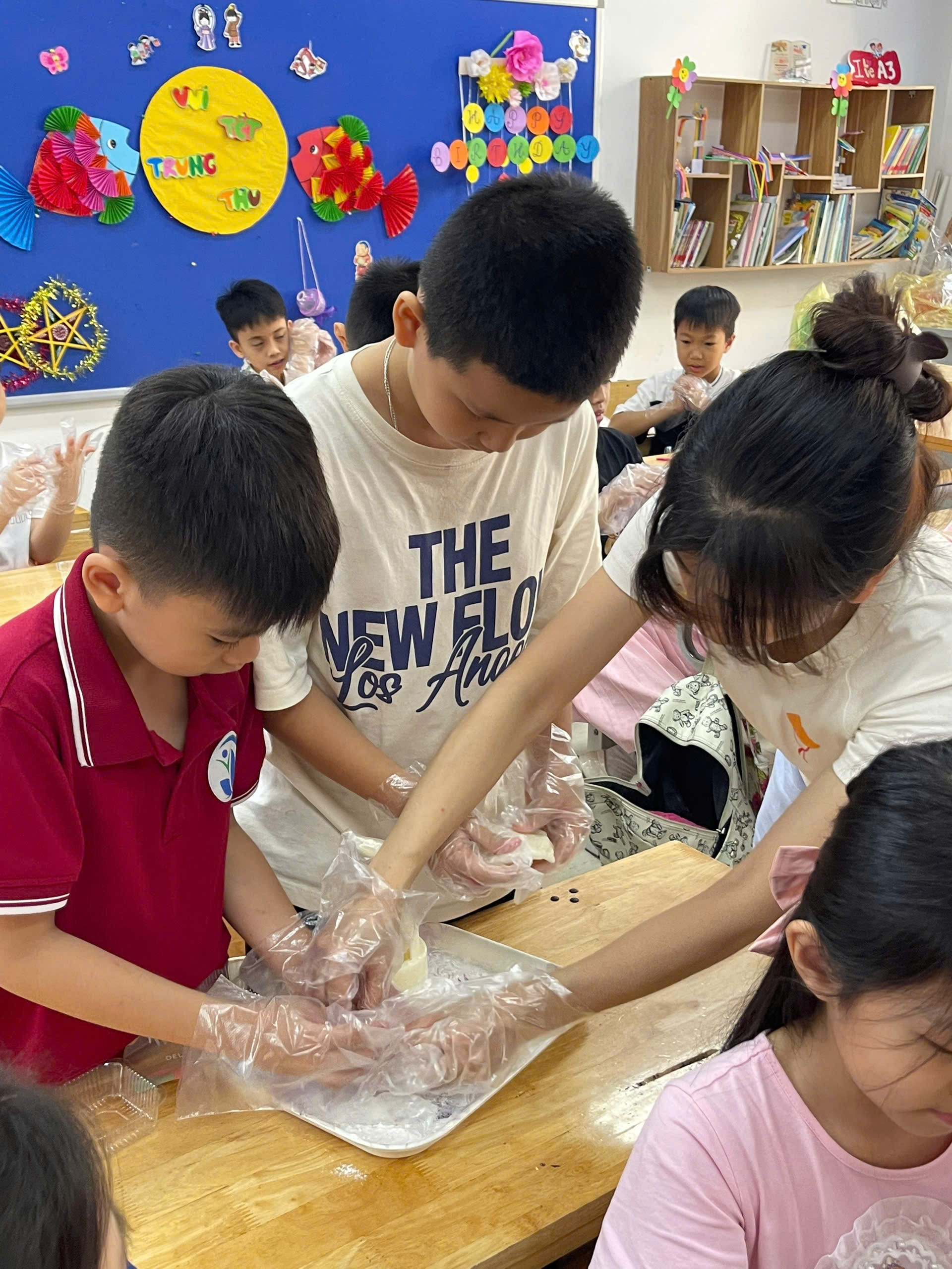 Hoạt động diễn ra sôi nổi với sự đồng hành nhiệt tình của Ban Phụ huynh và sự hướng dẫn tận tâm của cô giáo chủ nhiệm. Các em học sinh được trực tiếp tham gia vào từng công đoạn: từ nhào bột, nặn bánh đến trang trí. Những đôi bàn tay nhỏ bé, còn vụng về nhưng tràn đầy háo hức, đã tạo nên những chiếc bánh dẻo xinh xắn, mang hương vị truyền thống của Trung thu.