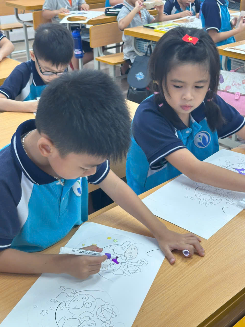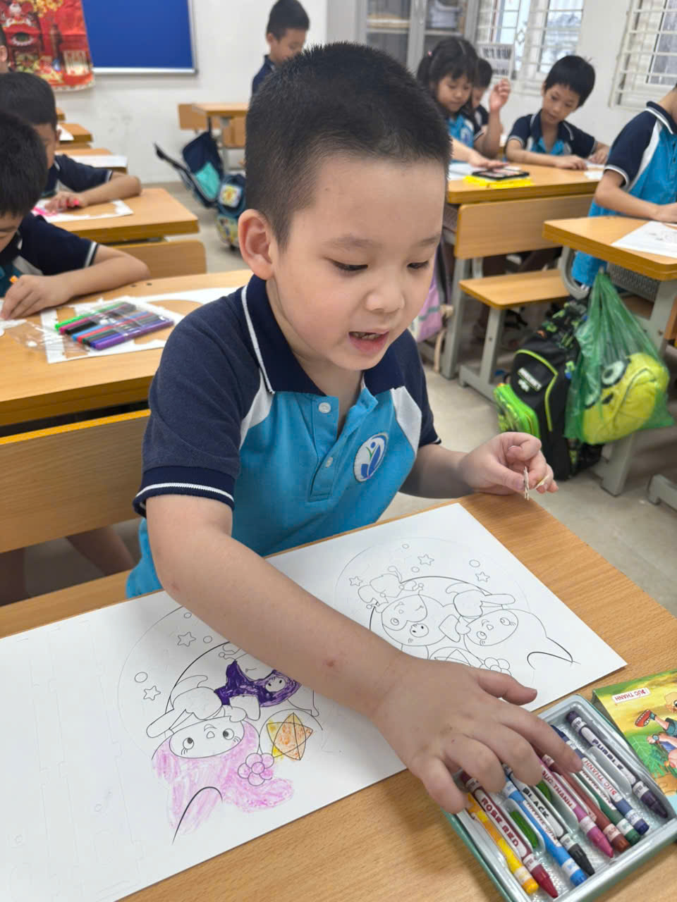 Hoạt động chính của lớp 2A2 năm nay là tô màu và trang trí mặt nạ Trung thu. Với đôi bàn tay khéo léo và sự sáng tạo phong phú, các bạn nhỏ đã biến những chiếc mặt nạ trắng đơn sơ thành những tác phẩm nghệ thuật đầy màu sắc. Nào là mặt nạ chú Cuội, chị Hằng, nào là những con vật ngộ nghĩnh đáng yêu, tất cả đều toát lên sự hồn nhiên và trí tưởng tượng bay bổng của tuổi thơ.