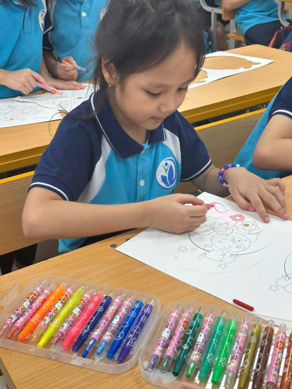 Các bạn nhỏ lớp 2A1 say sưa tô màu, sáng tạo nên những chiếc mặt nạ rực rỡ sắc màu.