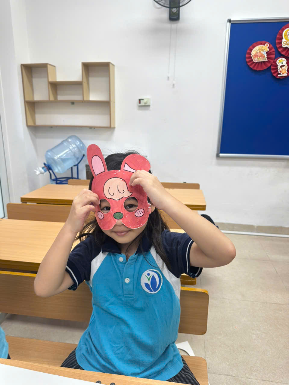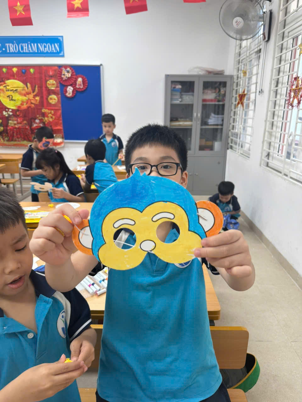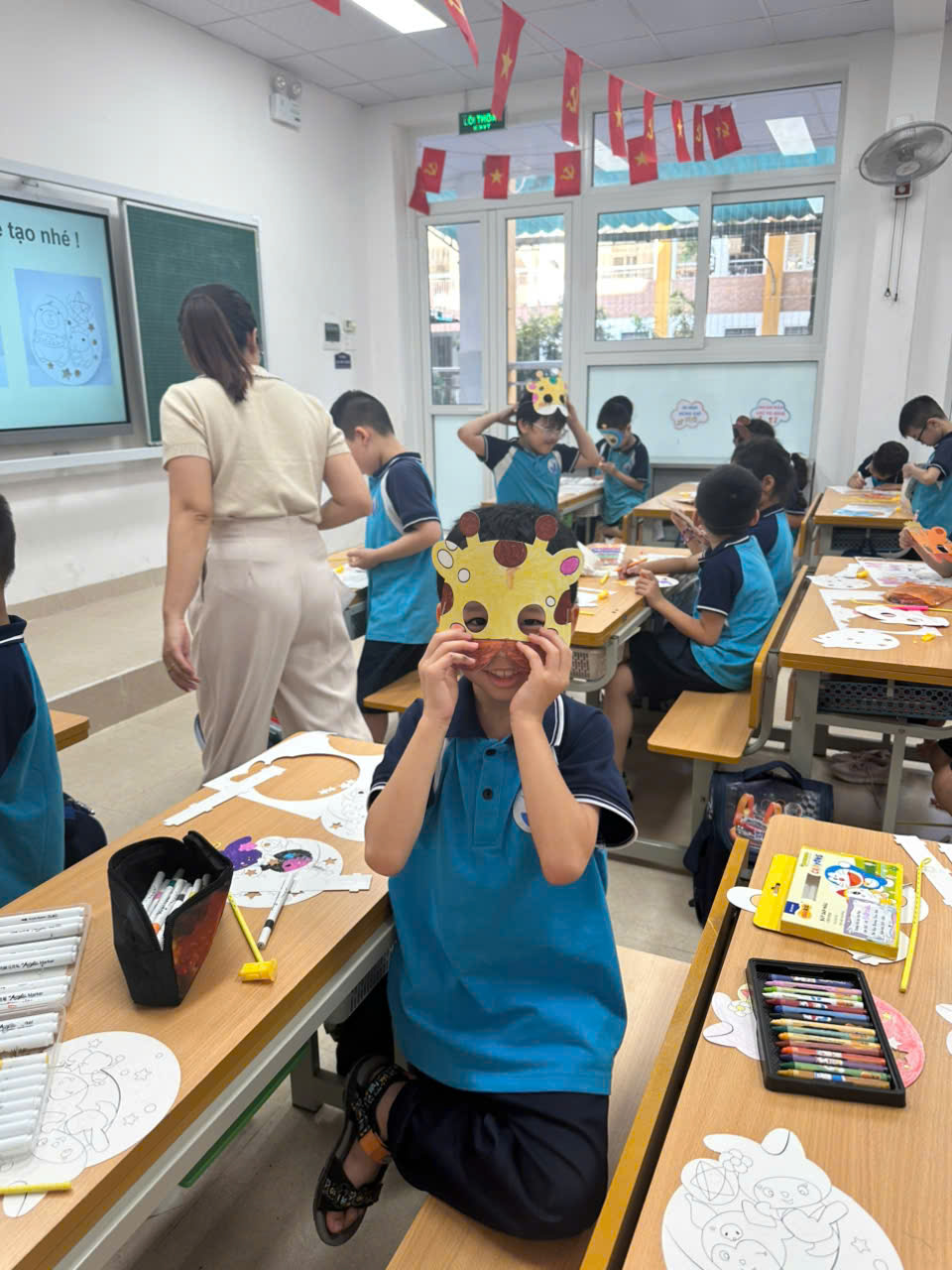 Sau khi hoàn thành, các em còn hào hứng đeo thử mặt nạ, khoe với thầy cô và bạn bè. Khuôn mặt nào cũng ánh lên niềm vui, tiếng cười giòn giã vang khắp lớp học.