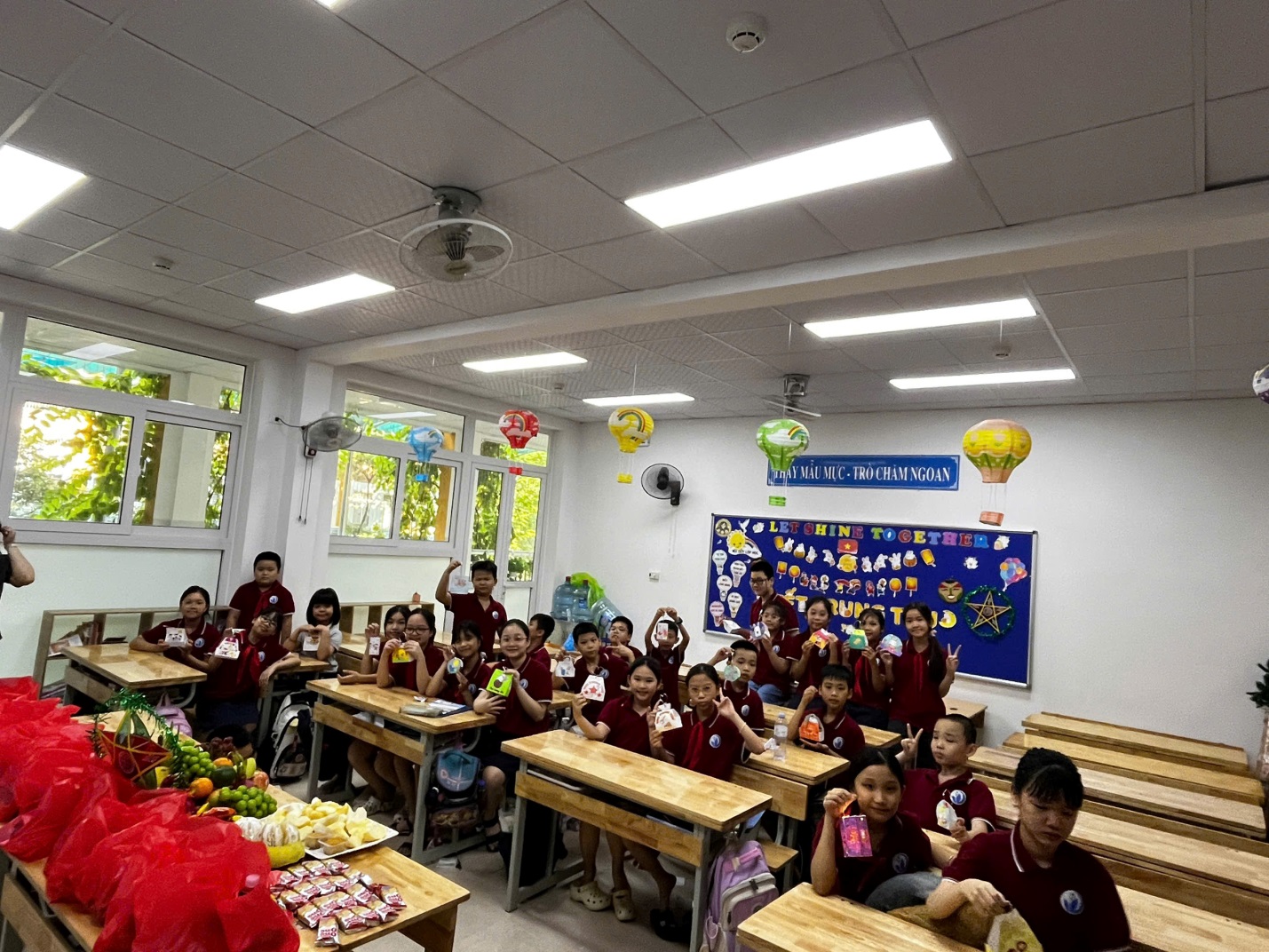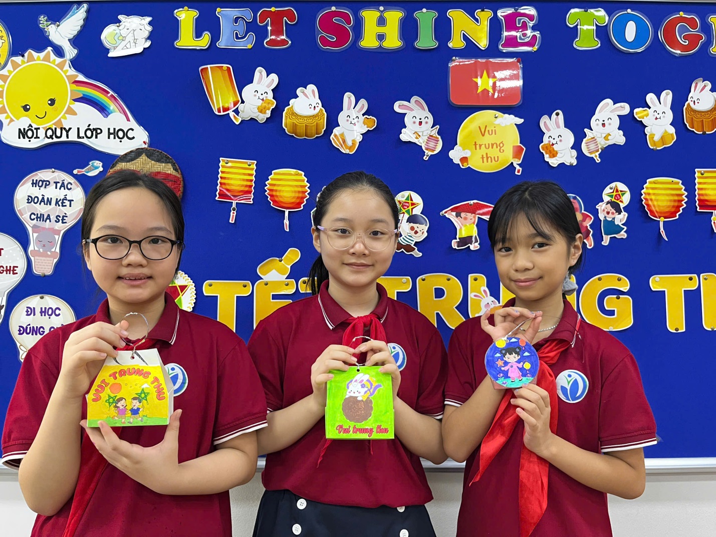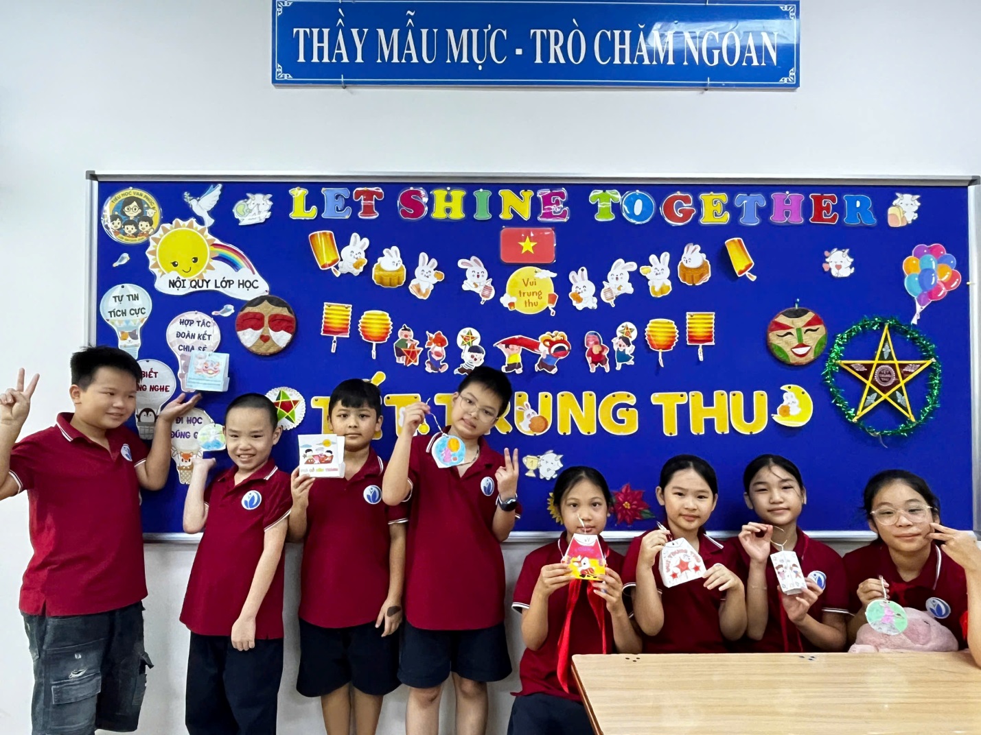 Cô và trò lớp 5A1 rạng rỡ, nụ cười hồn nhiên trong ngày hội trăng rằm.
