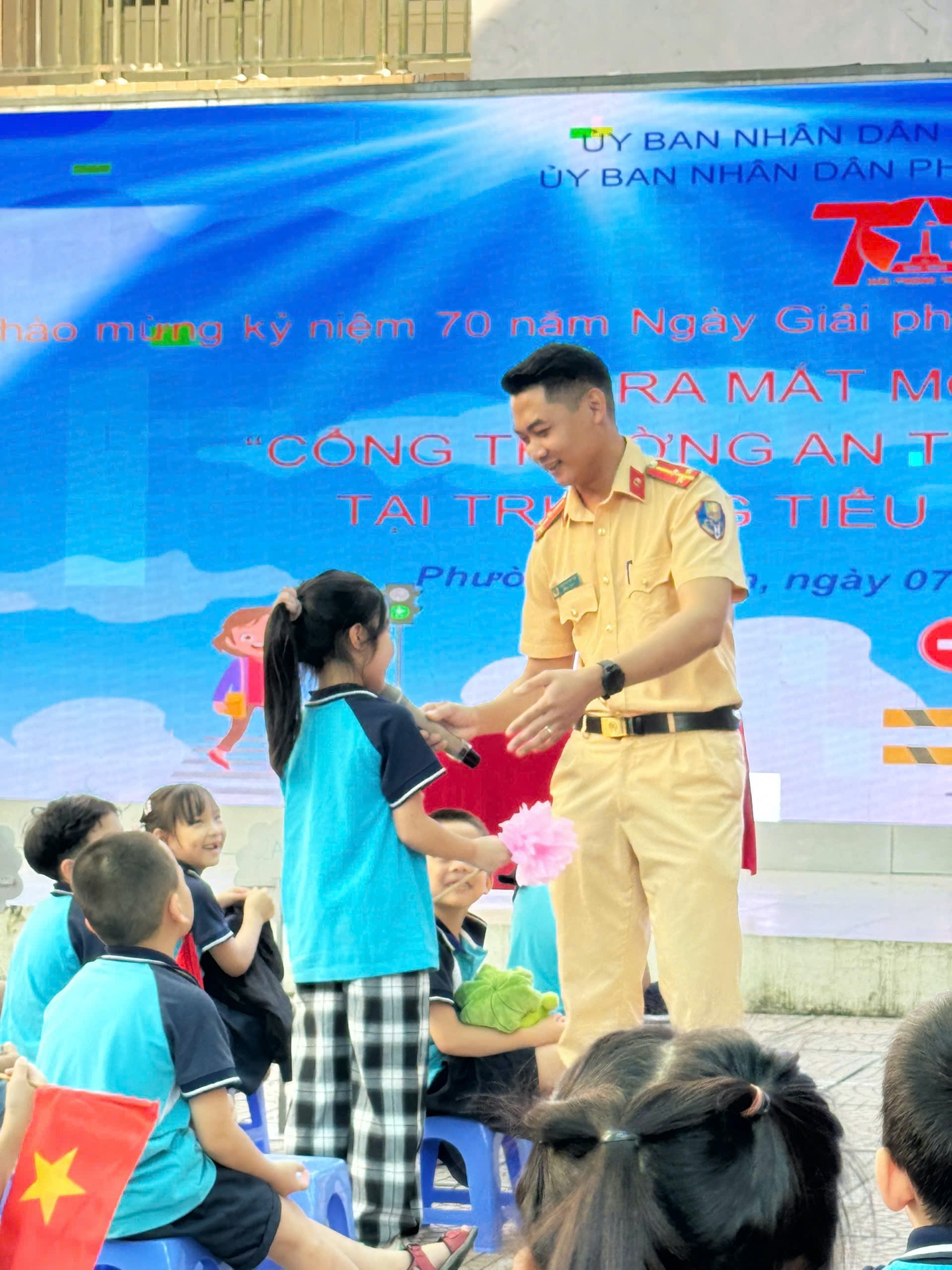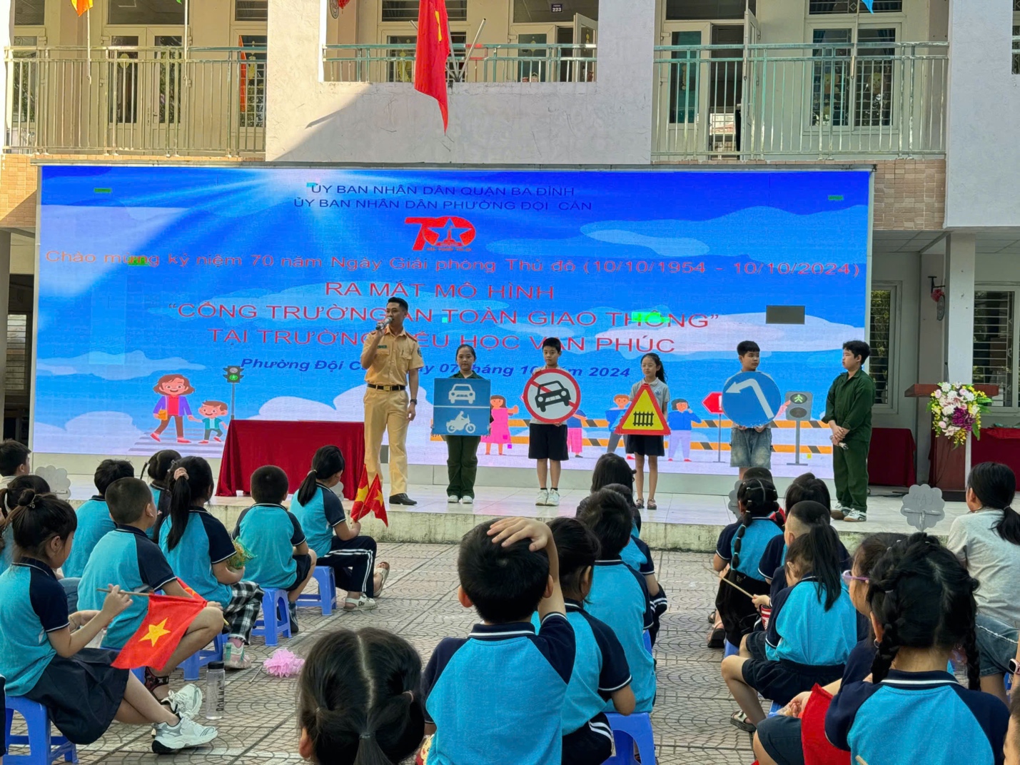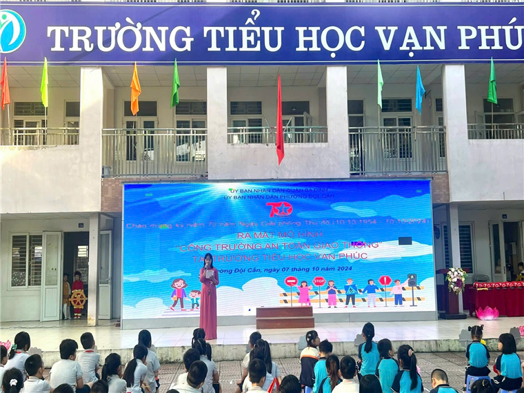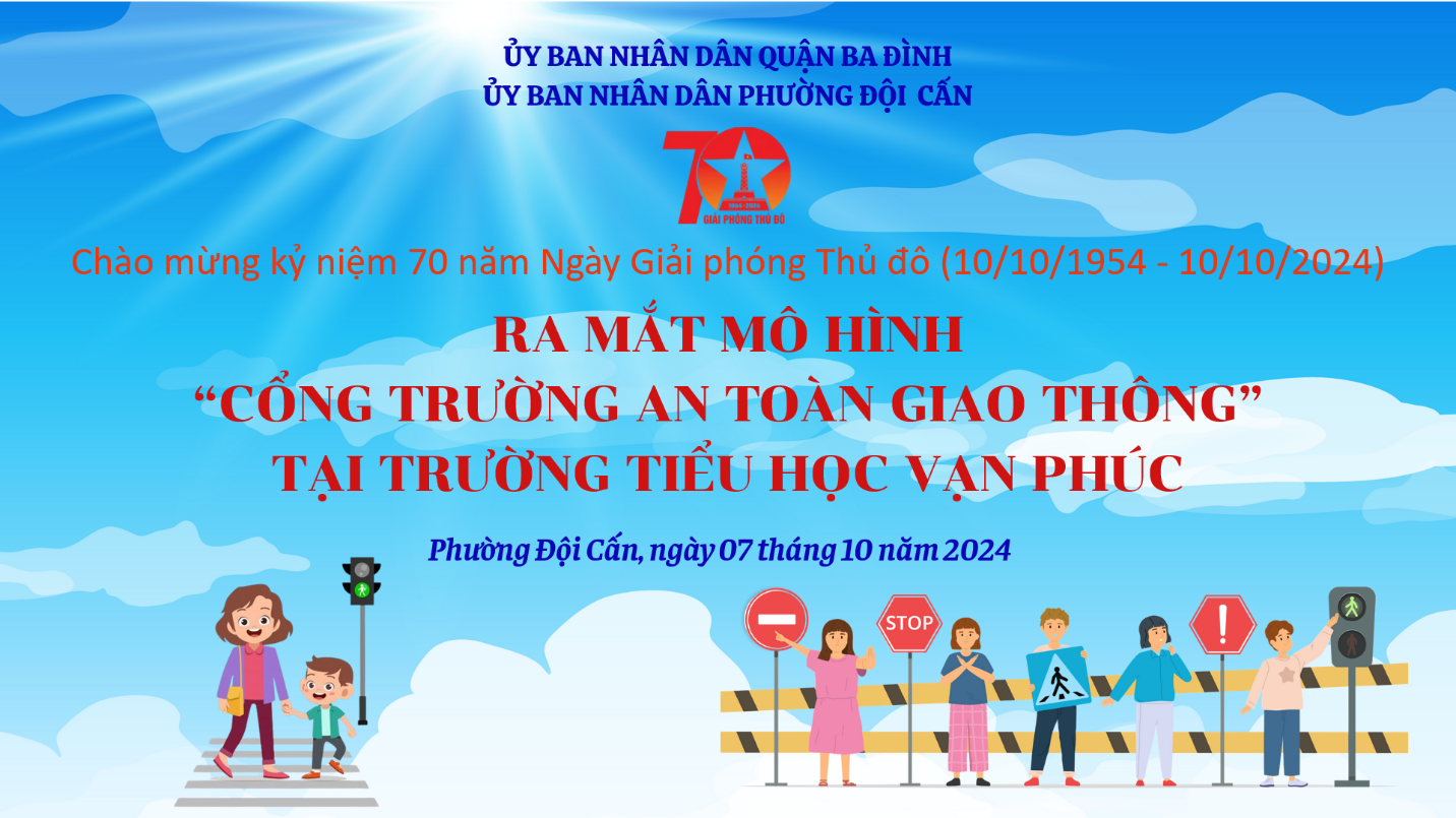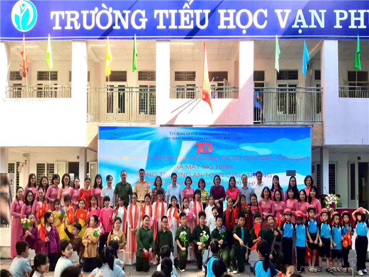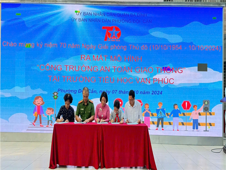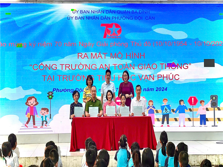 Căn cứ chương trình phối hợp số 11/CTrPH-BCA-BGDĐT ngày 19/10/2022 giữa Bộ Công an và Bộ Giáo dục và Đào tạo về tăng cường công tác tuyên truyền, phổ biến, giáo dục pháp luật về trật tự, an toàn giao thông trong các cơ sở giáo dục giai đoạn 2022-2025; Kế hoạch số 29/KH-BCA-C08 ngày 27/01/2023 của Bộ Công an về thực hiện Chương trình phối hợp số 11/CTrPH-BCA-BGDĐT ngày 19/10/2022 giữa Bộ Công an và Bộ Giáo dục và Đào tạo tăng cường công tác tuyên tuyền phổ biến, giáo dục pháp luật về TTATGT trong các cơ sở giáo dục giai đoạn 2022-2025; Thực hiện chỉ đạo của UBND quận Ba Đình về triển khai Lễ ra mắt “Cổng trường an toàn giao thông” chào mừng 70 năm Giải phóng Thủ đô tại các Trường học trên địa bàn quận. Sáng ngày 07/10, UBND phường Đội Cấn phối hợp với Công an phường và Trường Tiểu học Vạn Phúc long trọng tổ chức ra mắt mô hình “Cổng trường an toàn giao thông”.