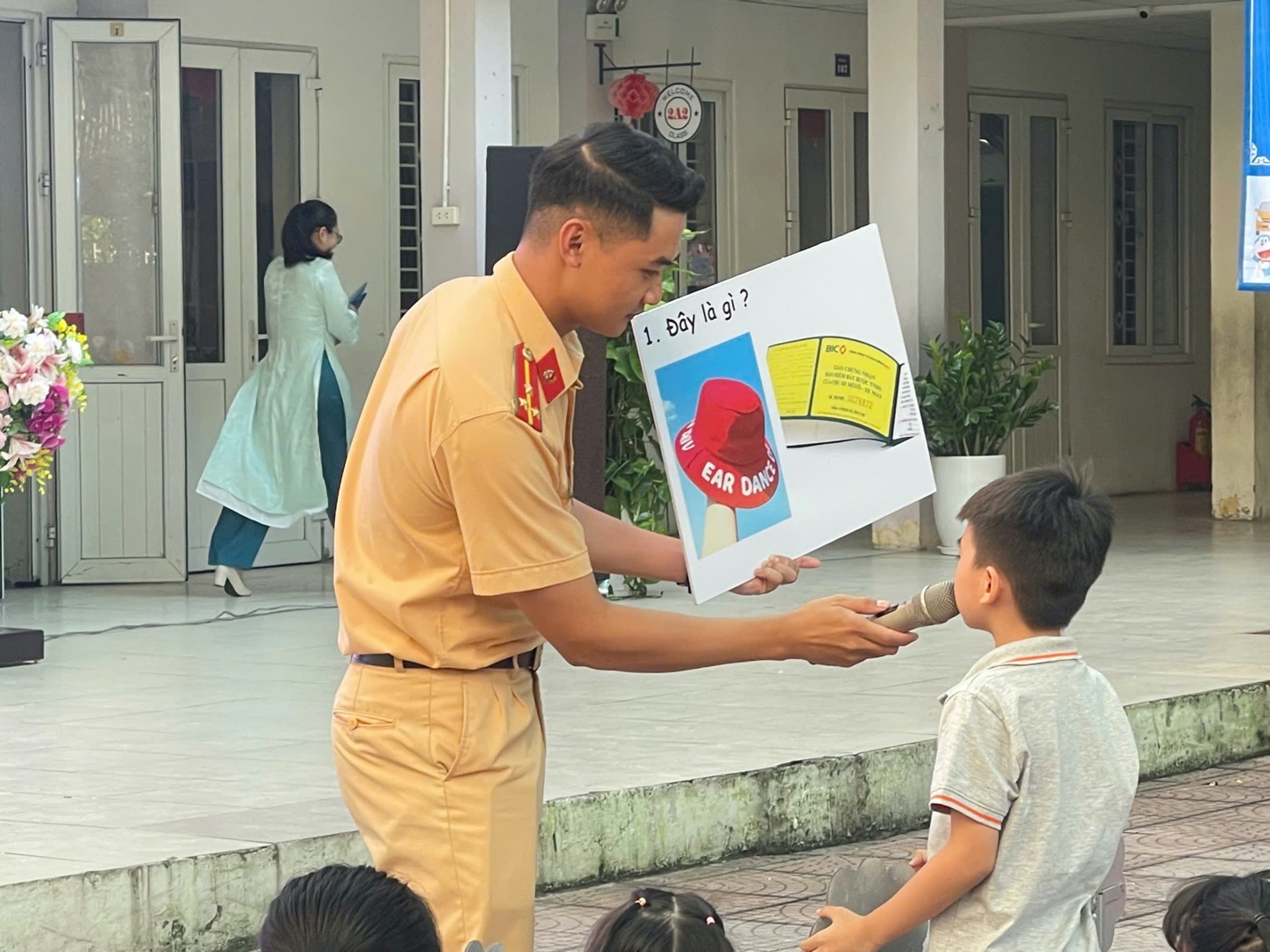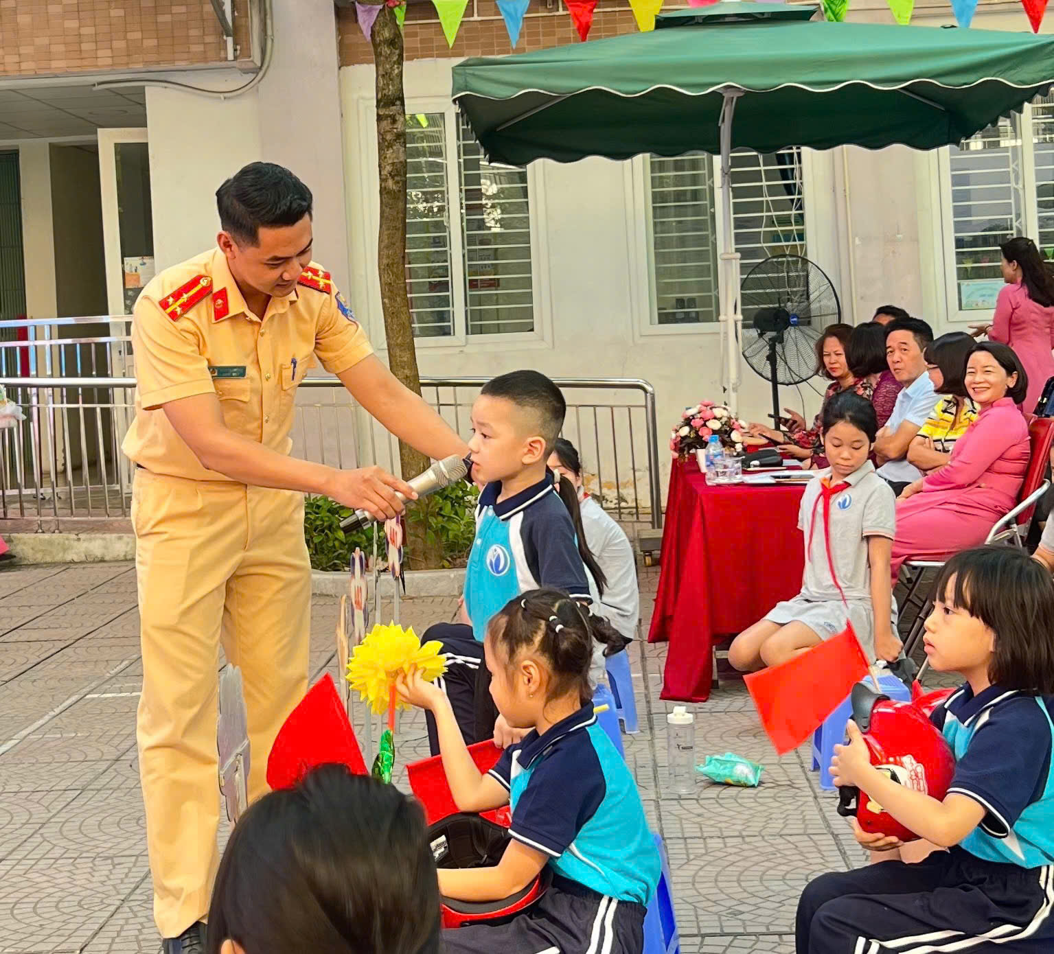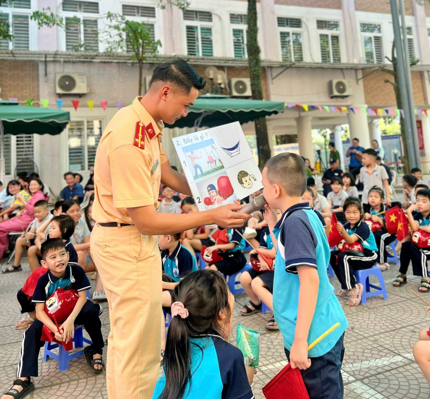 Các bạn học sinh hào hứng giao lưu với chú CSGT