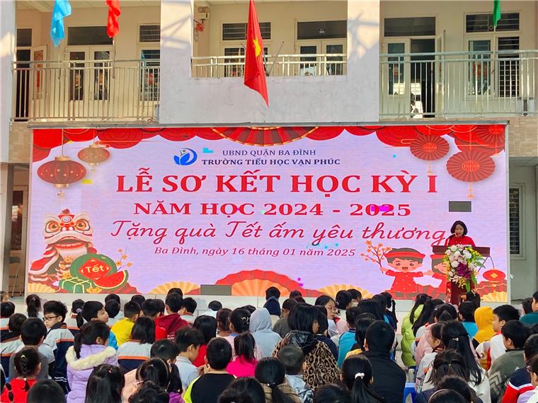 Sau nghi lễ chào cờ trang nghiêm, Nhà giáo Phùng Tố Nga - Hiệu trưởng nhà trường đã đọc báo cáo sơ kết học kì I năm học 2024-2025. Trong bài báo cáo, cô đã nhấn mạnh những thành tích mà tập thể giáo viên, học sinh nhà trường đã đạt được trong học kì qua. Đó là những kết quả ghi nhận sự phấn đấu nỗ lực của các em học sinh, sự tận tâm, nhiệt tình, trách nhiệm trong công việc của các cán bộ, giáo viên và nhân viên nhà trường. Qua bài phát biểu của cô, thầy và trò trường Tiểu học Vạn Phúc càng thêm tự hào về những thành tích mà nhà trường đã đạt được trong học kì vừa qua.