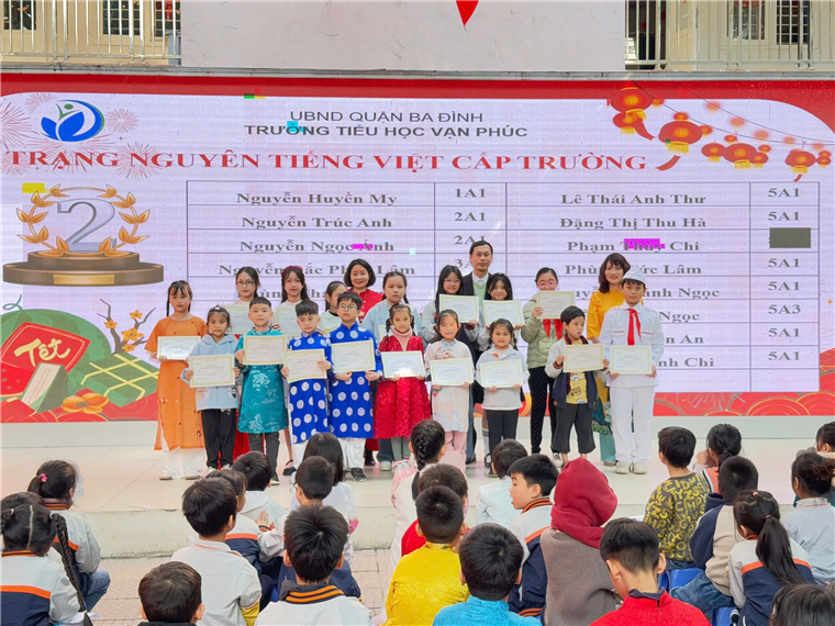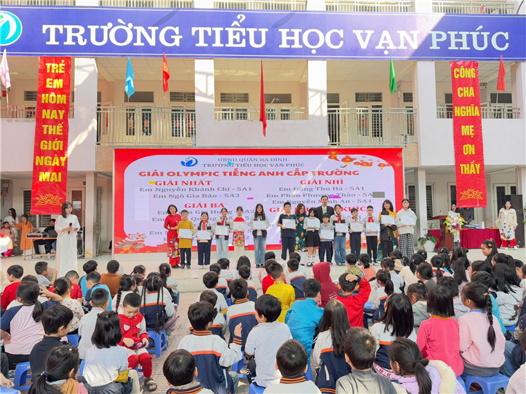 Nhà giáo Phùng Tố Nga - Bí thư Chi bộ, Hiệu trưởng nhà trường; nhà giáo Đinh Thị Thanh Xuân - Phó Hiệu trưởng và ông Bùi Vũ Cao - Trưởng ban đại diện Cha mẹ học sinh lên trao giải cho học sinh đạt giải trong cuộc thi Olympic Tiếng Anh cấp trường