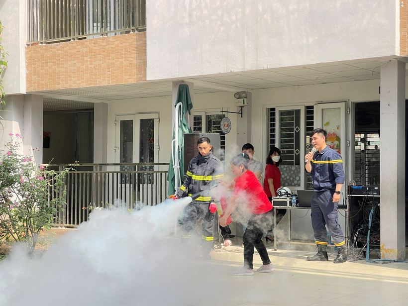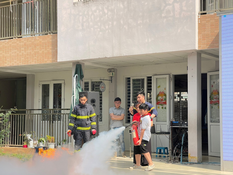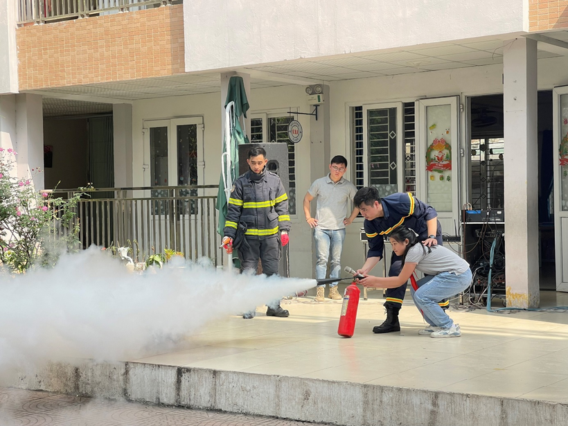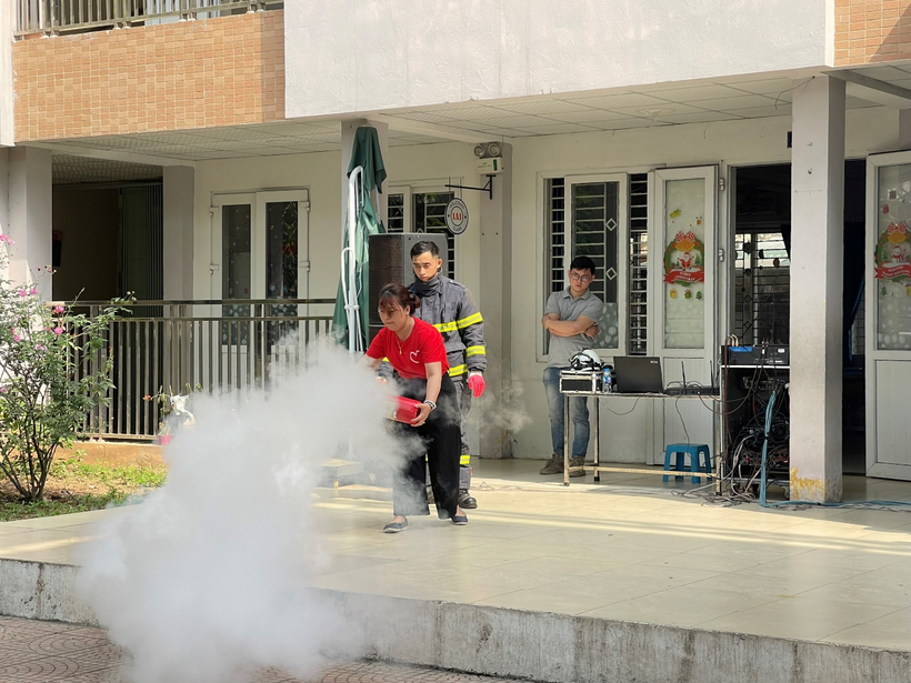 Phần diễn tập PCCC và cứu hộ cứu nạn được diễn ra ngay sau đó với giả định ngọn lửa bốc lên từ vị trí xảy ra cháy tại phòng học 223 tầng 2 sau đó cháy lan ra các khu vực xung quanh. Tại các phòng học nhà trường có khoảng 500 học sinh. Các con HS được thực hành ngay cách hô hoán báo cháy, dùng cánh tay che phần mũi và cúi thấp người để di chuyển trật tự men theo tường.