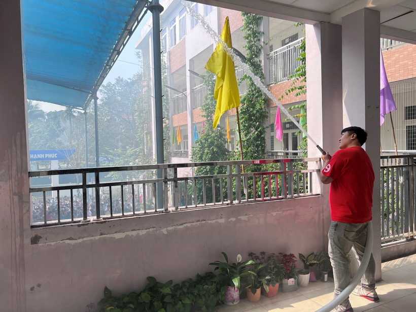 Các thầy cô giáo được thực hành cách dùng bình cứu hỏa chữa cháy và họng nước chữa cháy vách tường để xử lý đám cháy. Đồng thời các thầy, cô đang giảng dạy tại các phòng học ở tầng 1, tầng 2, tầng 3 cho học sinh lần lượt di chuyển từ trong phòng học ra ngoài cửa và đi qua đường cầu thang bộ xuống phía dưới (đi khom và sử dụng tay, khăn tay, vạt áo che đường hô hấp theo như những hướng dẫn đã được học), tập kết tại khu vực quy định, giáo viên tổ chức điểm danh học sinh và báo cáo hiệu trưởng. Đối với các học bị thương sử dụng phương pháp dìu nạn nhân đi qua cầu thang bộ xuống phía dưới an toàn.