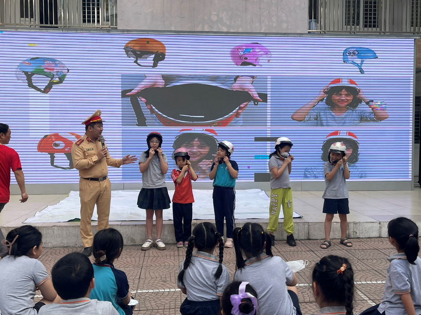Mở đầu chương trình cán bộ Cảnh sát giao thông hướng dẫn các con học sinh về việc chấp hành đúng luật khi tham gia giao thông và hướng dẫn cách đội mũ bảo hiểm đúng cách.