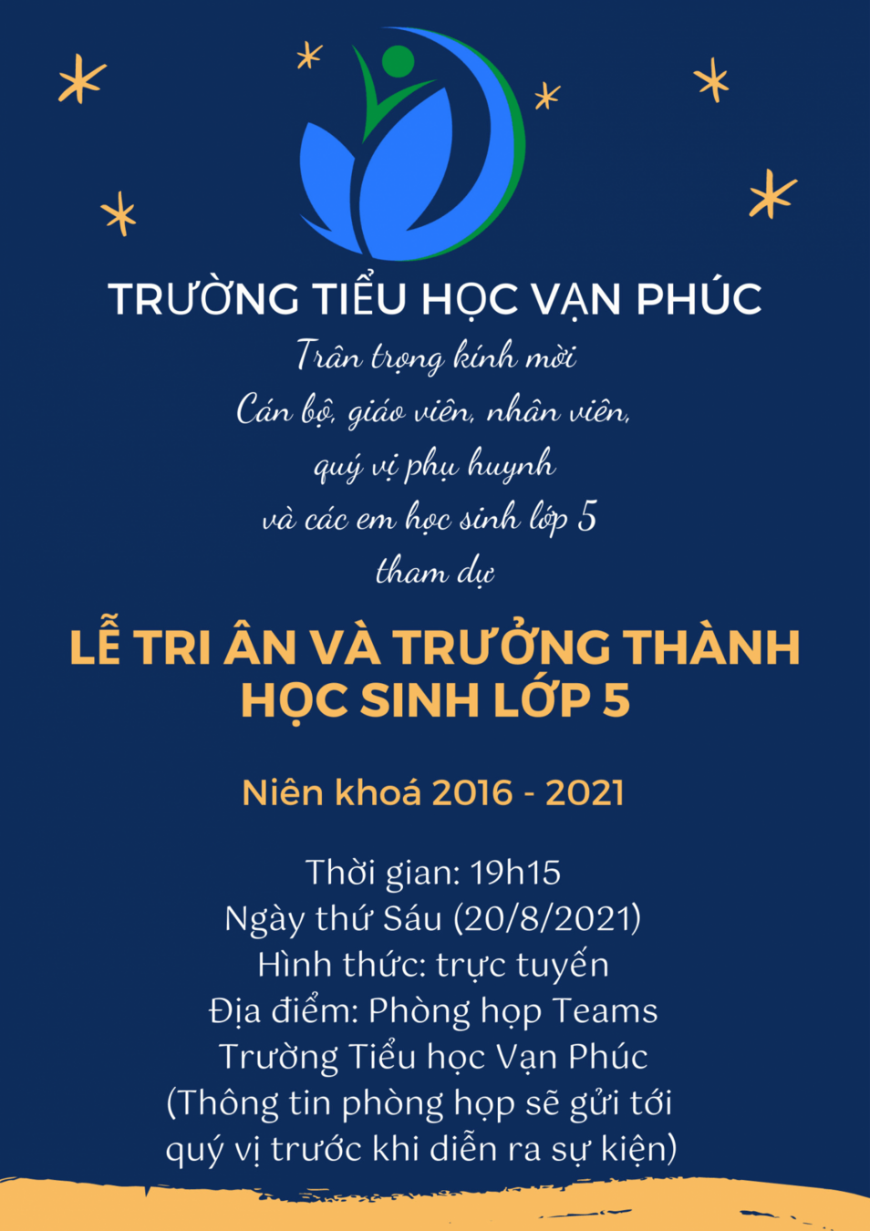 Thứ Sáu ngày 20/8/2021 Trường Tiểu học Vạn Phúc tổ chức Lễ tri ân và trưởng thành học sinh lớp 5 niên khóa 2016 - 2021 với hình thức trực tuyến.