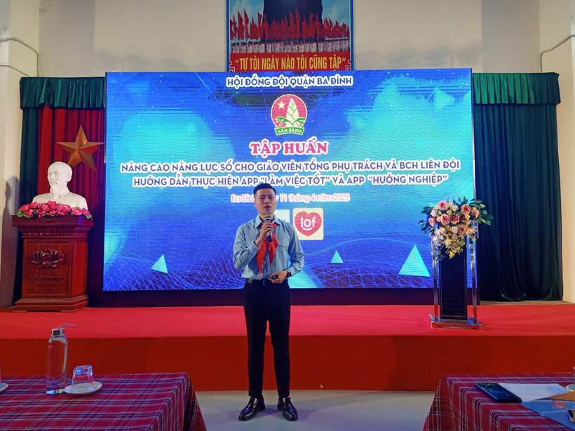 Trong buổi sáng, thầy Trần Minh Cường - Giảng viên Khoa Kỹ năng nghiệp vụ Đội - Trường Lê Duẩn đã lên lớp 02 nội dung là: Tập huấn nâng cao năng lực số cho giáo viên Tổng phụ trách và BCH Liên đội, hướng dẫn thực hiện app Làm việc tốt (đối với khối Tiểu học) và app Hướng nghiệp (đối với khối THCS) và Tập huấn nghiệp vụ công tác Đội cho BCH Liên đội.