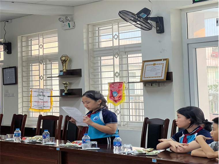 Em Phạm Thùy Chi - đội viên lớp 5A3 trình bày tham luận về học tập