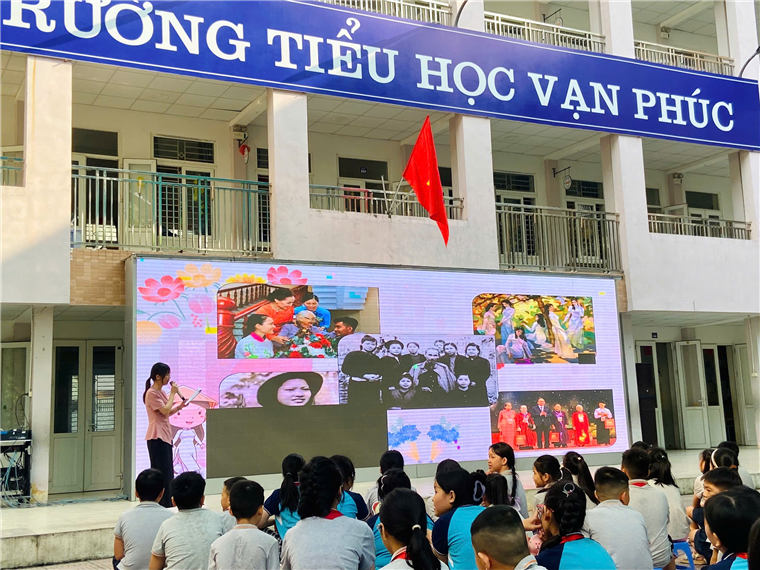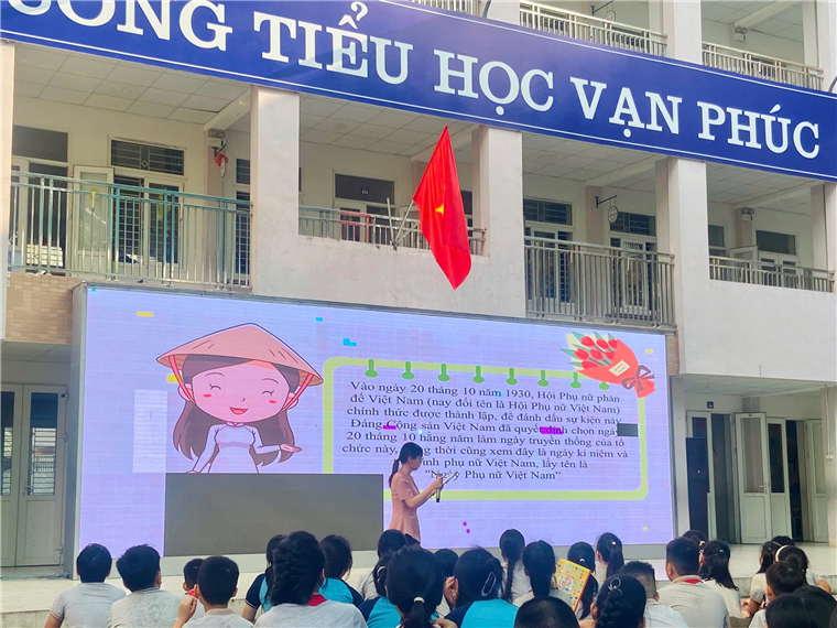 Nhân dịp kỷ niệm 94 năm Ngày Phụ nữ Việt Nam (20/10/1930 - 20/10/2024), sáng ngày 14/10/2024, Trường Tiểu học Vạn Phúc tổ chức tiết Sinh hoạt dưới cờ với chủ đề: “Chào mừng Ngày Phụ nữ Việt Nam 20/10”. Thông qua các hoạt động ý nghĩa, nhà trường mong muốn các em học sinh biết trân trọng, quan tâm hơn đến những người phụ nữ xung quanh mình.