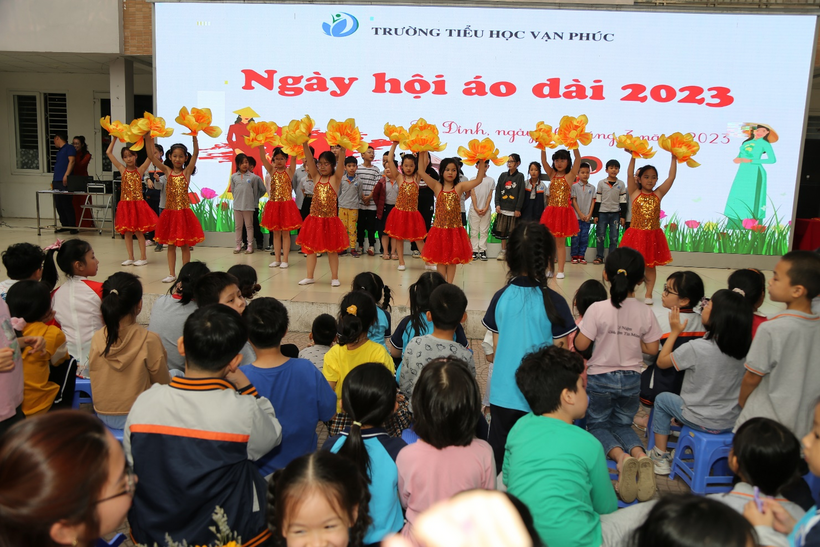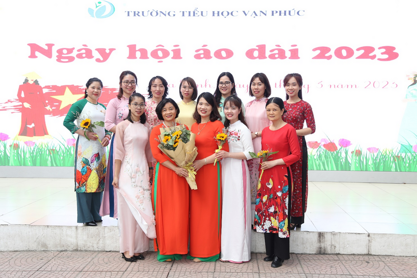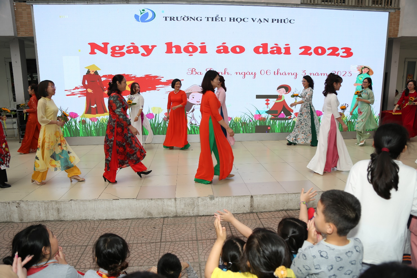 Nhân dịp này, giáo viên trường Tiểu học Vạn Phúc duyên dáng hưởng ứng “Tuần lễ áo dài Việt Nam”, qua từng bước đi uyển chuyển với tà áo dài trong phần trình diễn thời trang.