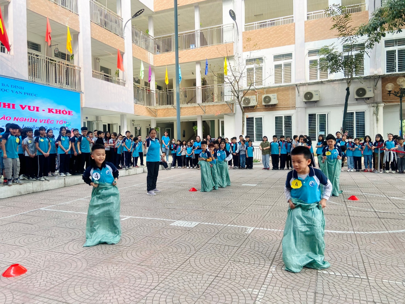 Tại ngày hội, đội chơi khối 1 tham gia phần thi “Nhảy bao bố”. Các bạn học sinh khối lớp 1 dù nhỏ tuổi nhất nhưng rất nhanh nhẹn và khéo léo di chuyển, đã xuất sắc vượt qua thử thách của phần thi.