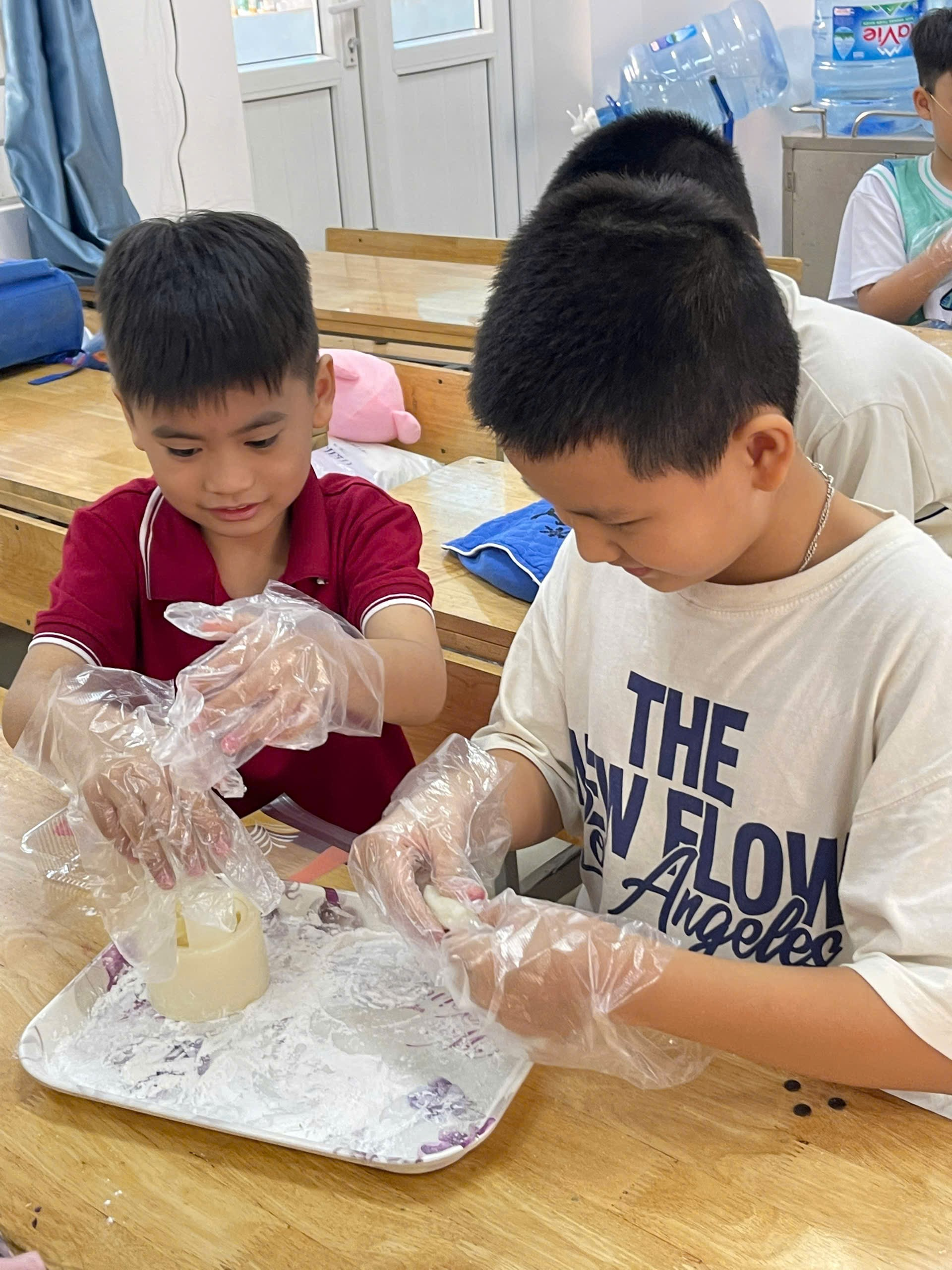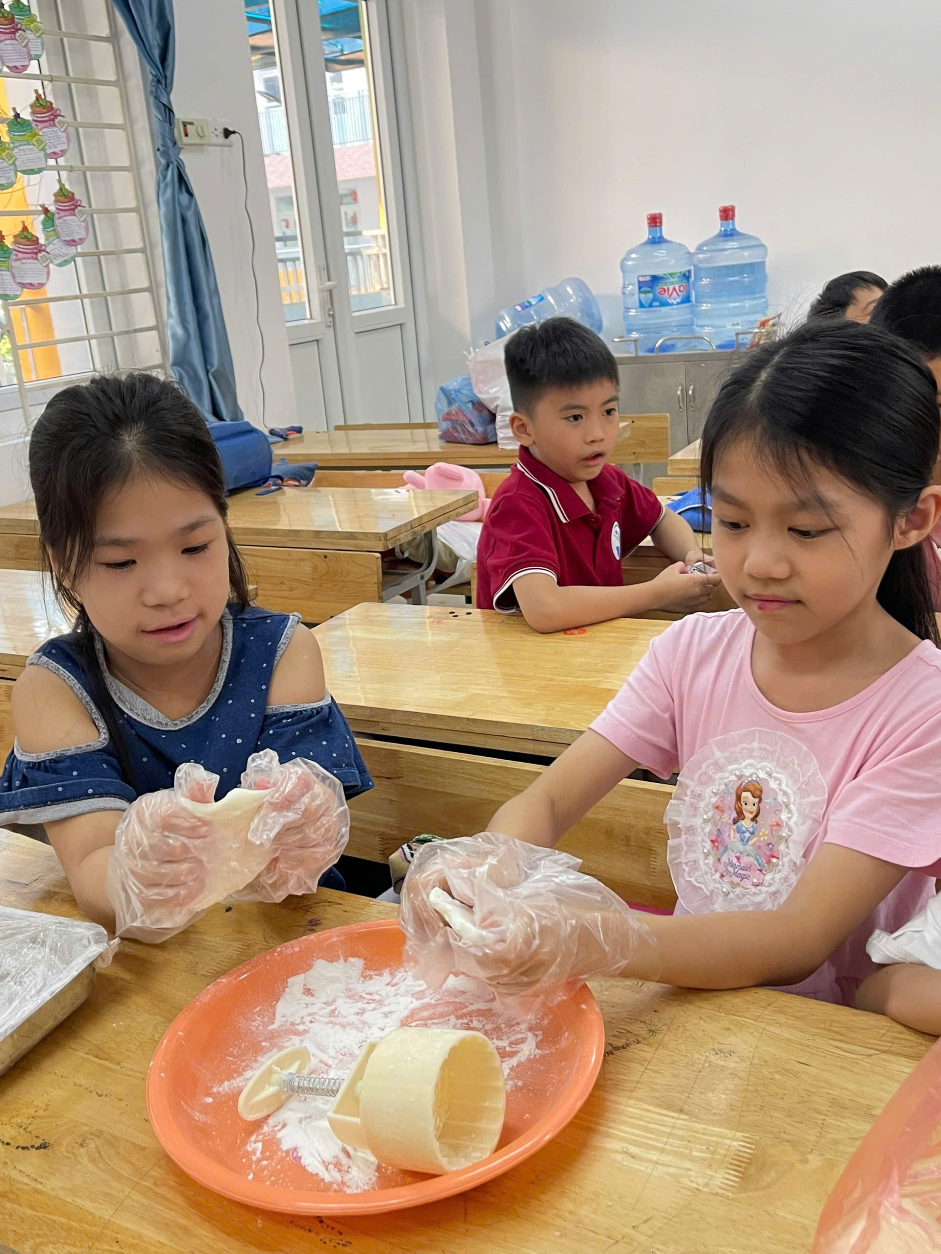 Hoạt động diễn ra sôi nổi với sự đồng hành nhiệt tình của Ban Phụ huynh và sự hướng dẫn tận tâm của cô giáo chủ nhiệm. Các em học sinh được trực tiếp tham gia vào từng công đoạn: từ nhào bột, nặn bánh đến trang trí. Những đôi bàn tay nhỏ bé, còn vụng về nhưng tràn đầy háo hức, đã tạo nên những chiếc bánh dẻo xinh xắn, mang hương vị truyền thống của Trung thu.