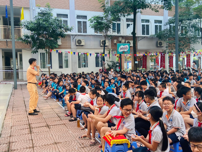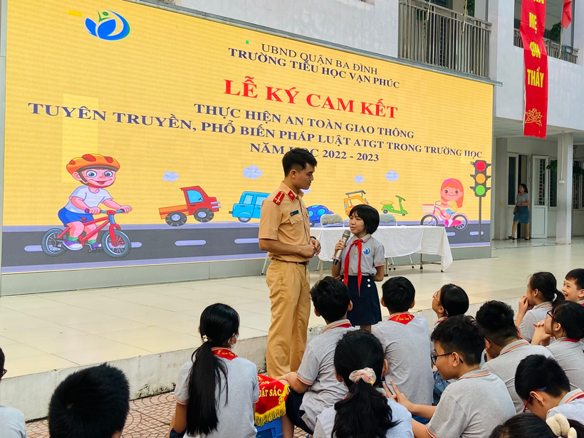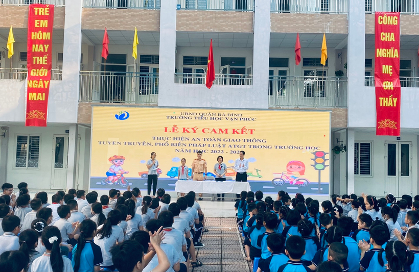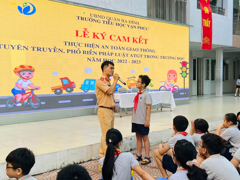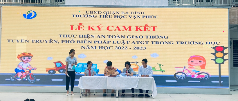 Tại buổi lễ, đại diện Công an quận Ba Đình, Ban giám hiệu nhà trường, học sinh và đại diện cha mẹ học sinh ký cam kết cùng nhà trường giáo dục con em thực hiện tốt quy định về ATGT năm học 2022 - 2023. Nội dung cam kết gồm: Luôn chấp hành nghiêm chỉnh quy định về pháp luật trật tự ATGT; đội mũ bảo hiểm đạt chuẩn, cài quai đúng quy cách khi ngồi trên xe mô tô, xe gắn máy tham gia giao thông; đi bộ và sang đường đúng nơi quy định; chấp hành nghiêm túc các quy định của nhà trường về ATGT; phụ huynh và học sinh không tụ tập trước cổng trường, không đi ngược chiều, dừng đỗ gây cản trở, ùn tắc giao thông…