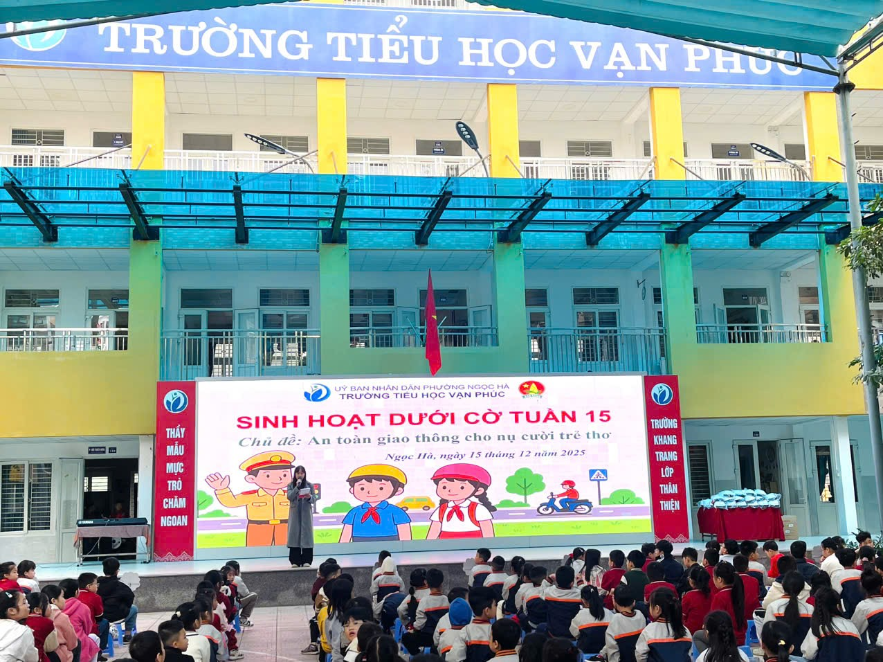 Sau nghi thức chào cờ, các em học sinh được theo dõi video Tuyên truyền An toàn giao thông, trong đó tập trung vào việc đội mũ bảo hiểm đúng cách khi tham gia giao thông bằng xe máy, xe đạp điện.