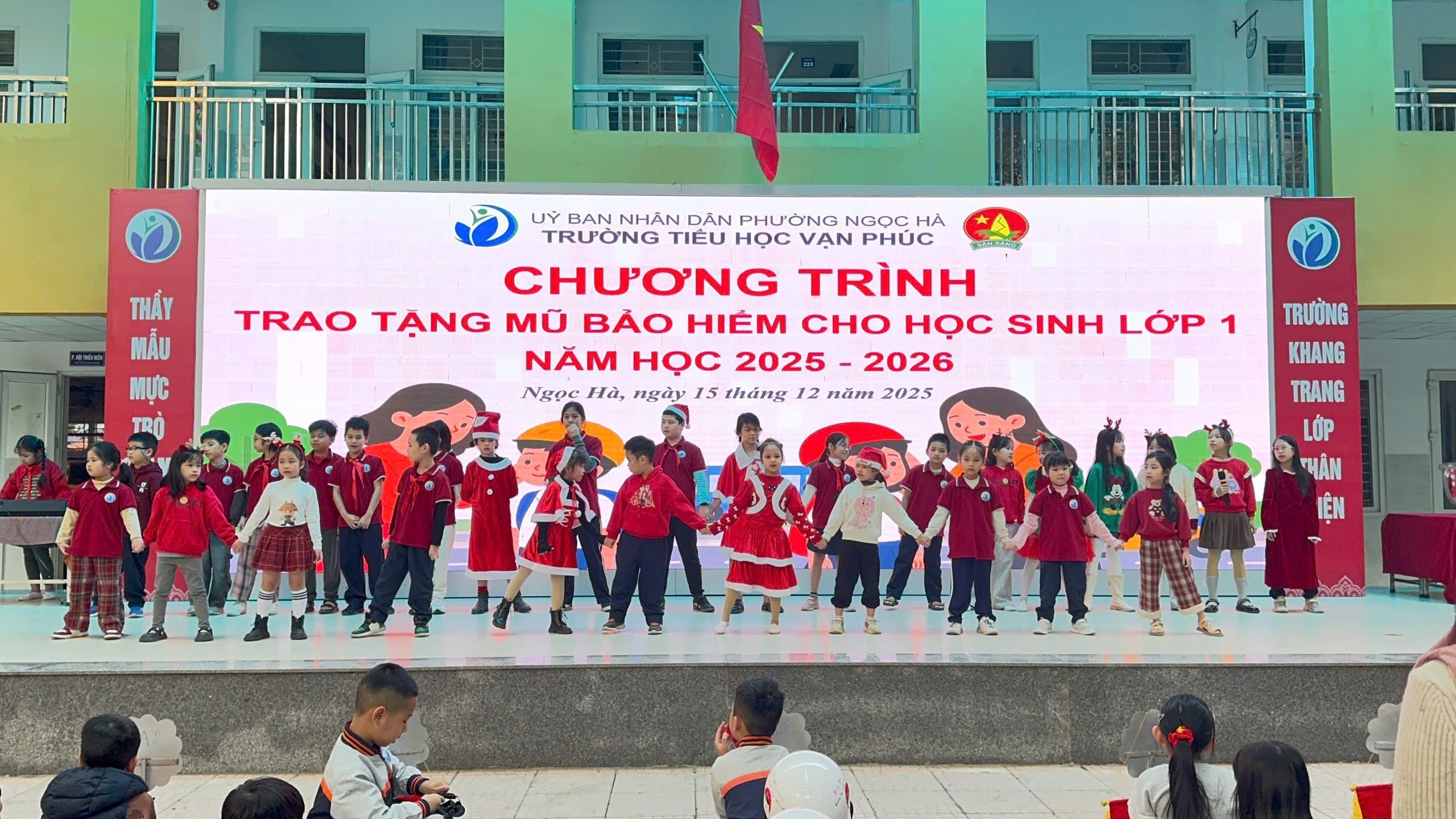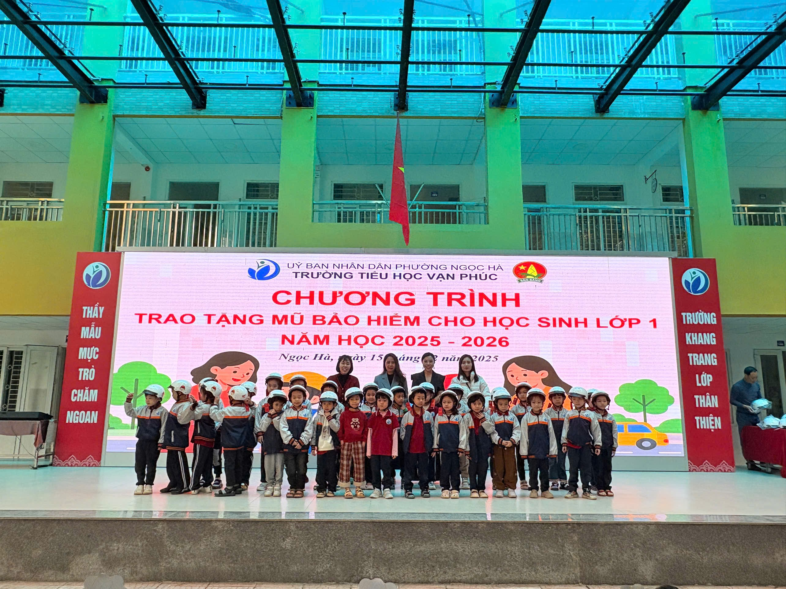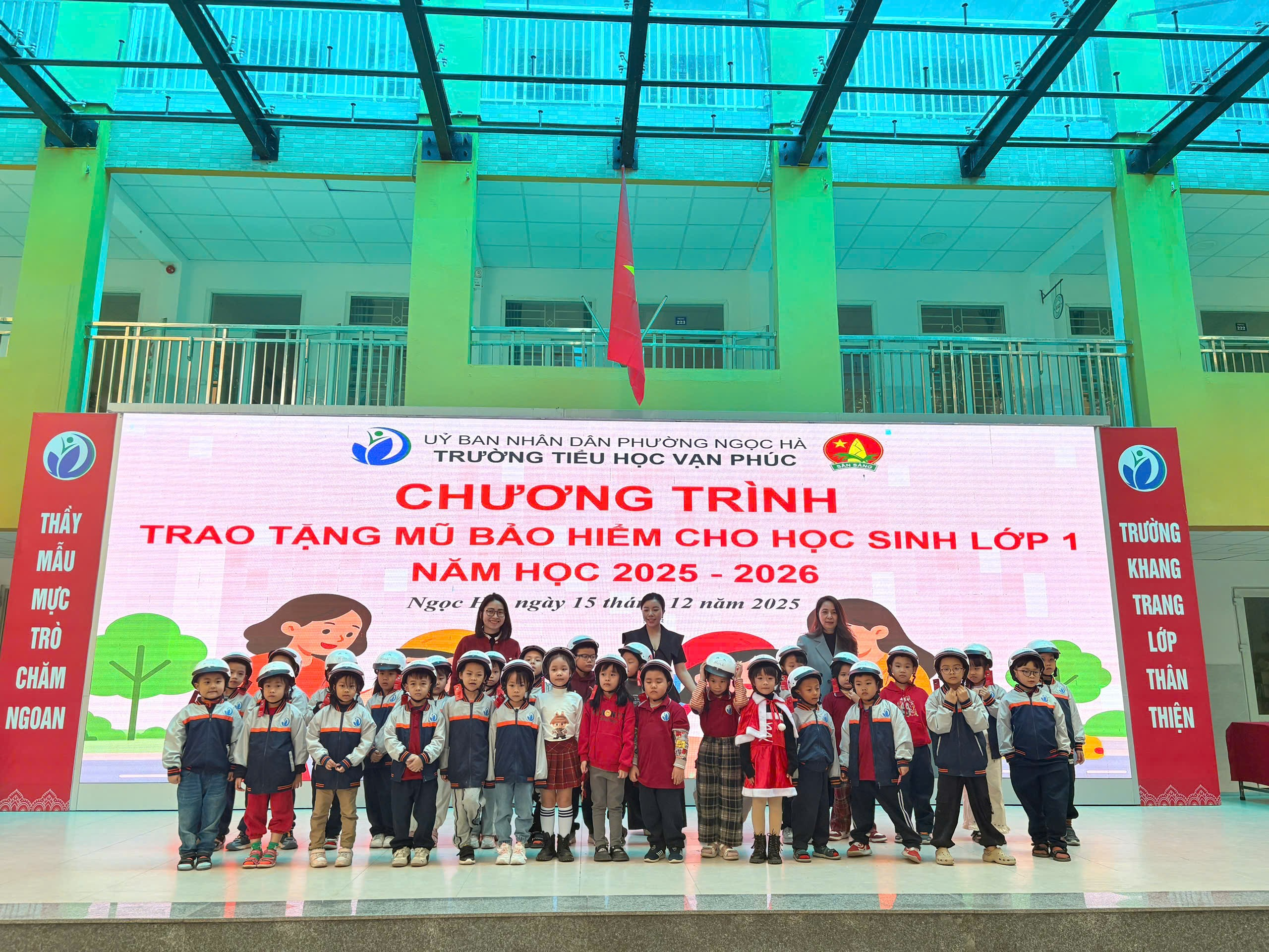 Tại buổi sinh hoạt dưới cờ ngày 15/12, hơn 60 em học sinh lớp 1 của Trường Tiểu học Vạn Phúc đã được trao tặng những chiếc mũ bảo hiểm xinh xắn, đạt quy chuẩn kỹ thuật quốc gia.