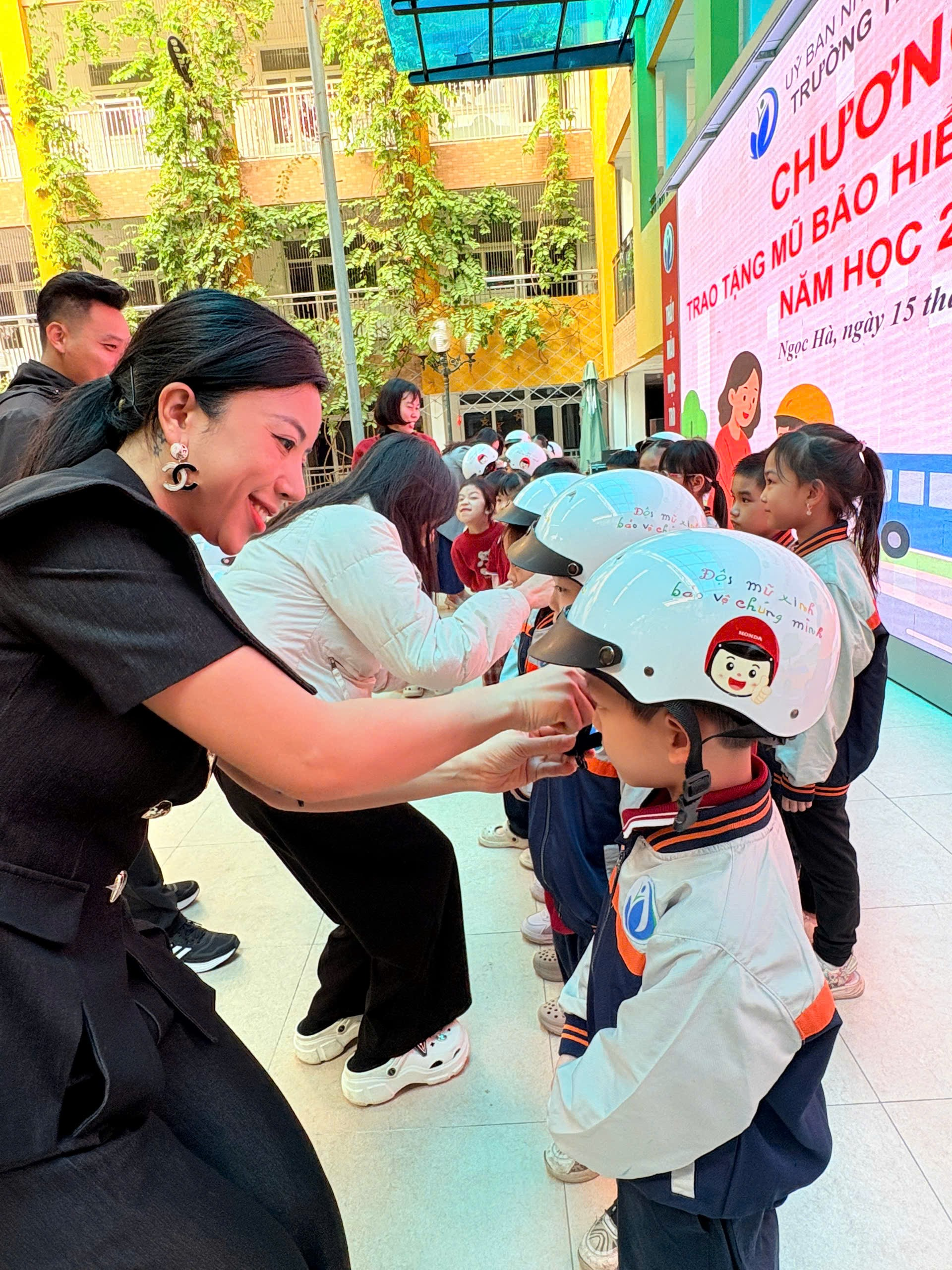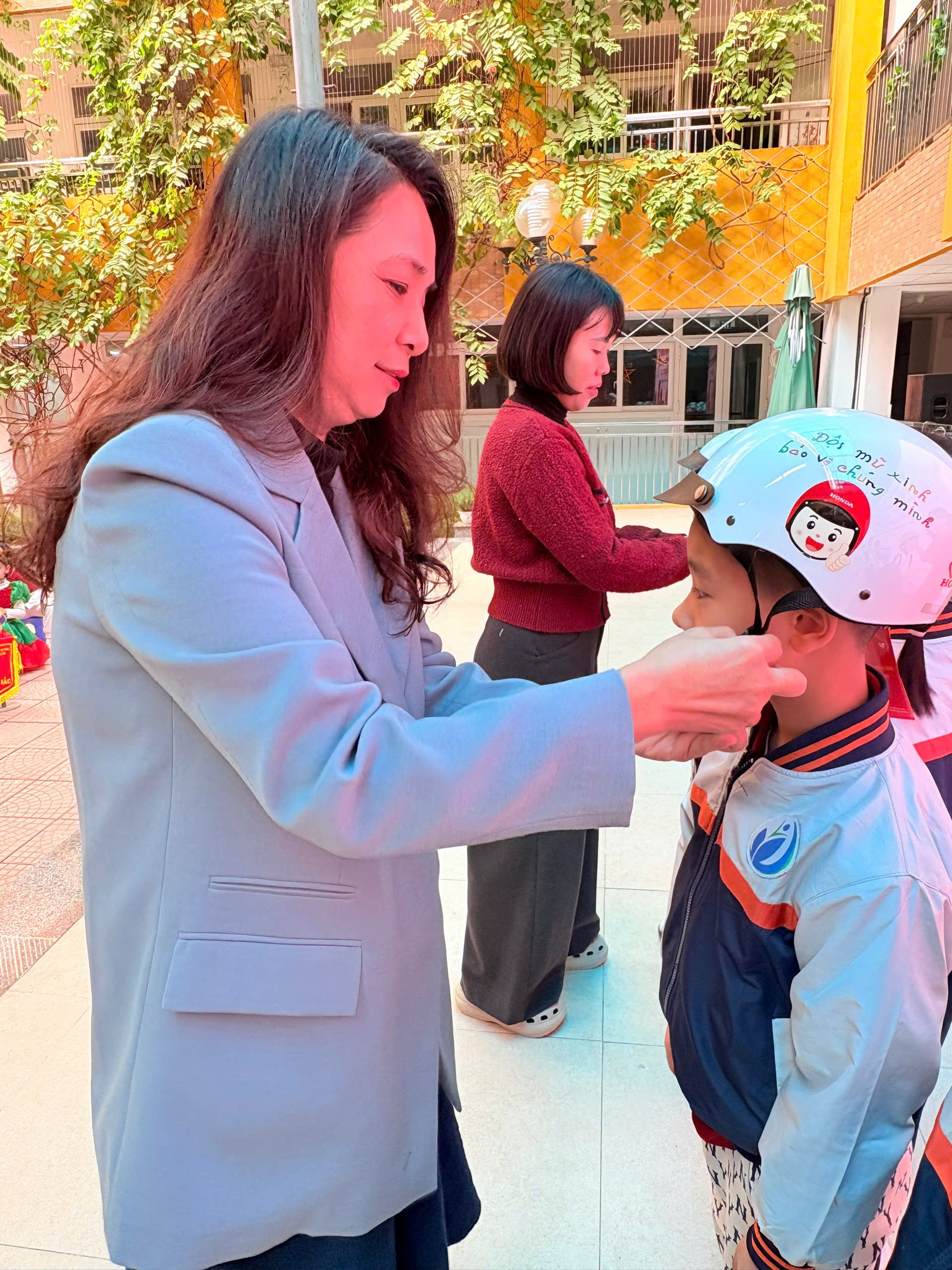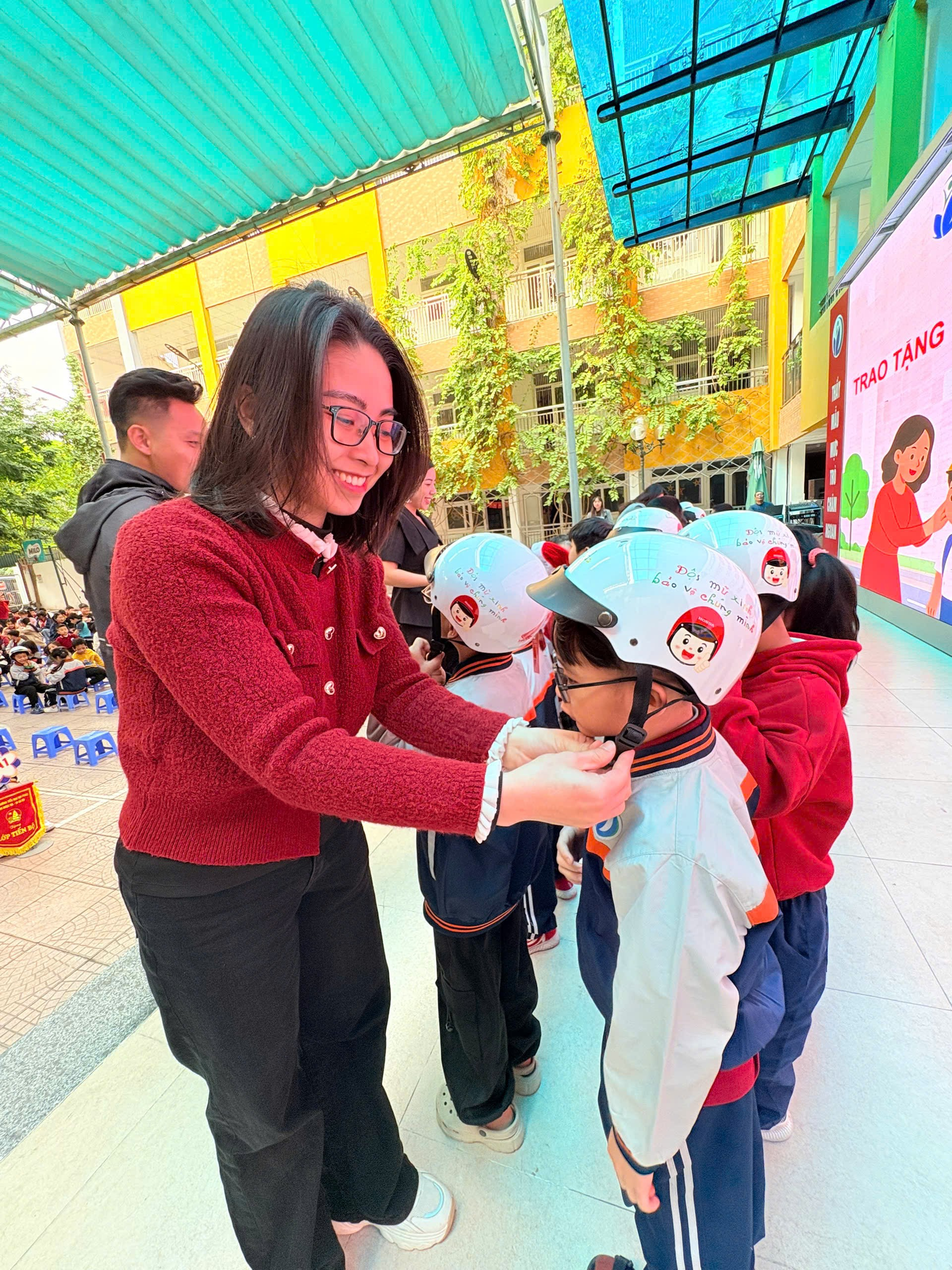 Ngay sau phần tuyên truyền, nhà trường đã tổ chức trao tặng mũ bảo hiểm cho học sinh lớp 1, thể hiện sự quan tâm sâu sắc tới an toàn của các em khi tham gia giao thông.