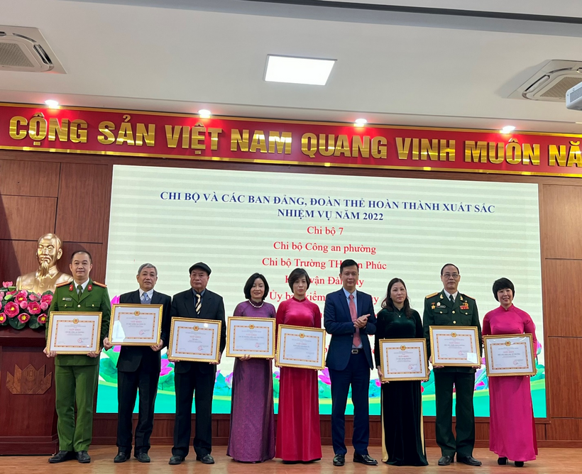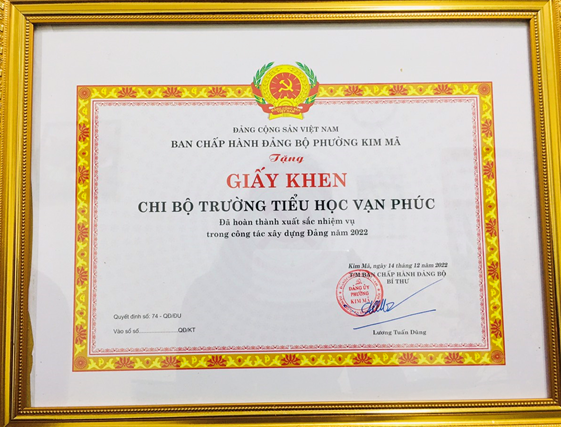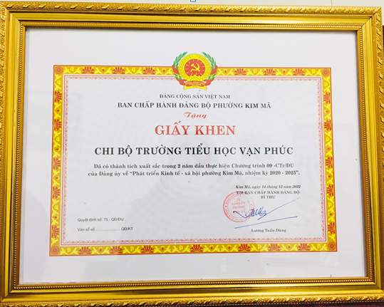 Trong 2 năm đầu thực hiện Chương trình 09-CTr/ĐU của Đảng Ủy về “Phát triển Kinh tế- xã hội Phường Kim Mã, nhiệm kỳ 2020- 2025, Chi bộ Trường Tiểu học Vạn Phúc rất vinh dự được khen thưởng là Chi bộ hoàn thành Xuất sắc nhiệm vụ trong công tác xây dựng Đảng năm 2022 và tập thể nhà trường được tặng giấy khen có thành tích Xuất sắc trong thực hiện các Chương trình công tác toàn khóa của Đảng ủy giữ nhiệm kỳ 2020-2025 do Đảng uỷ, UBND phường Kim Mã trao tặng. Cá nhân đồng chí Phùng Tố Nga-Bí thư chi bộ-Hiệu trưởng và đồng chí Lưu Khánh Ly cũng đã được nhận giấy khen hoàn thành Xuất sắc nhiệm vụ năm 2022. Đây chính là kết quả ghi nhận sự nỗ lực, cố gắng của cá nhân và toàn thể Chi bộ, Hội đồng sư phạm nhà trường. Buổi tham gia Hội nghị thành công tốt đẹp. Chi bộ Trường TH Vạn Phúc rất vui mừng trước những thành quả đạt được trong năm 2022, bước sang năm 2023, thầy và trò nhà trường tiếp tục thi đua “Dạy tốt – Học tốt” cùng với chính quyền các cấp tích cực tham gia các hoạt động để xây dựng Đảng bộ vững mạnh hơn.