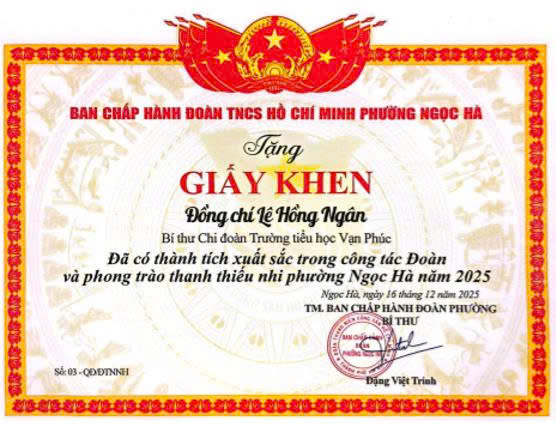 Tại hội nghị, Chi đoàn trường Tiểu học Vạn Phúc đã vinh dự nhận danh hiệu Tập thể đạt thành tích xuất sắc trong công tác Đoàn và phong trào thanh thiếu nhi phường Ngọc Hà năm 2025.