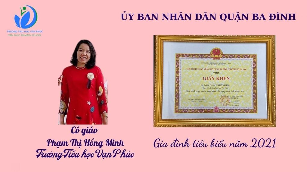 Gia đình cô giáo Phạm Thị Hồng Minh với sự nỗ lực, làm việc, đóng góp cho xã hội, luôn gương mẫu và đi đầu trong các phong trào từ cơ quan cho đến địa phương đã vinh dự được Chủ tịch UBND quận Ba Đình trao tặng Giấy khen Gia đình công nhân, viên chức, lao động tiêu biểu năm 2021.