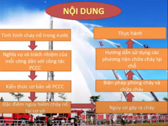 Tại buổi tập huấn, giảng viên đã nêu rõ mục đích của buổi tập huấn, giới thiệu nội dung cơ bản 7 văn bản pháp luật quy định về PCCC. Với nội dung cụ thể, rõ ràng, phần minh họa ảnh sinh động, rõ nét đã giúp các học viên thấy được tình hình cháy nổ trong nước; nghĩa vụ và trách nhiệm của mỗi công dân với công tác PCCC; đặc điểm cơ bản về PCCC; đặc điểm nguy hiểm cháy nổ tại cơ sở; nguy cơ gây ra cháy; biện pháp phòng cháy và chữa cháy; hướng dẫn sử dụng các phương tiện chữa cháy tại chỗ.