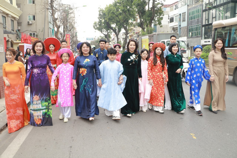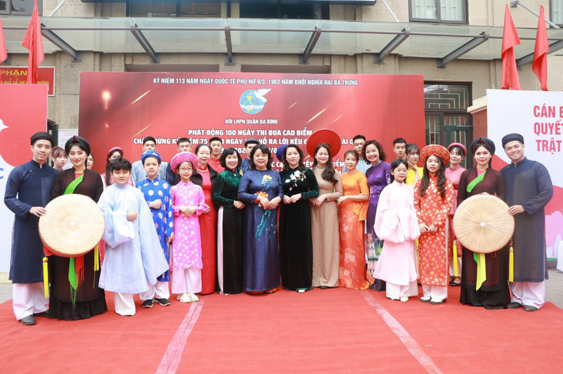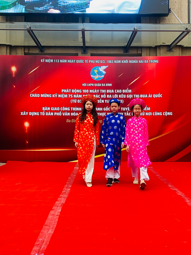Với tinh thần ấy sáng ngày 04/3/2023 Hội LHPN quận Ba Đình tổ chức chương trình Phát động đợt thi đua cao điểm chào mừng 75 năm ngày Bác Hồ ra lời kêu gọi thi đua ái quốc và gắn biển công trình tuyến phố điểm xây dựng tổ dân phố văn hóa kiểu mẫu trong ứng xử nơi công cộng tại trụ sở Đảng ủy - UBND phường Kim Mã. Vinh dự được chọn cử, 5 học sinh lớp 5A2 Trường Tiểu học Vạn Phúc đã hưởng ứng rất tích cực và tham gia vào phần trình diễn áo dài trong chương trình.