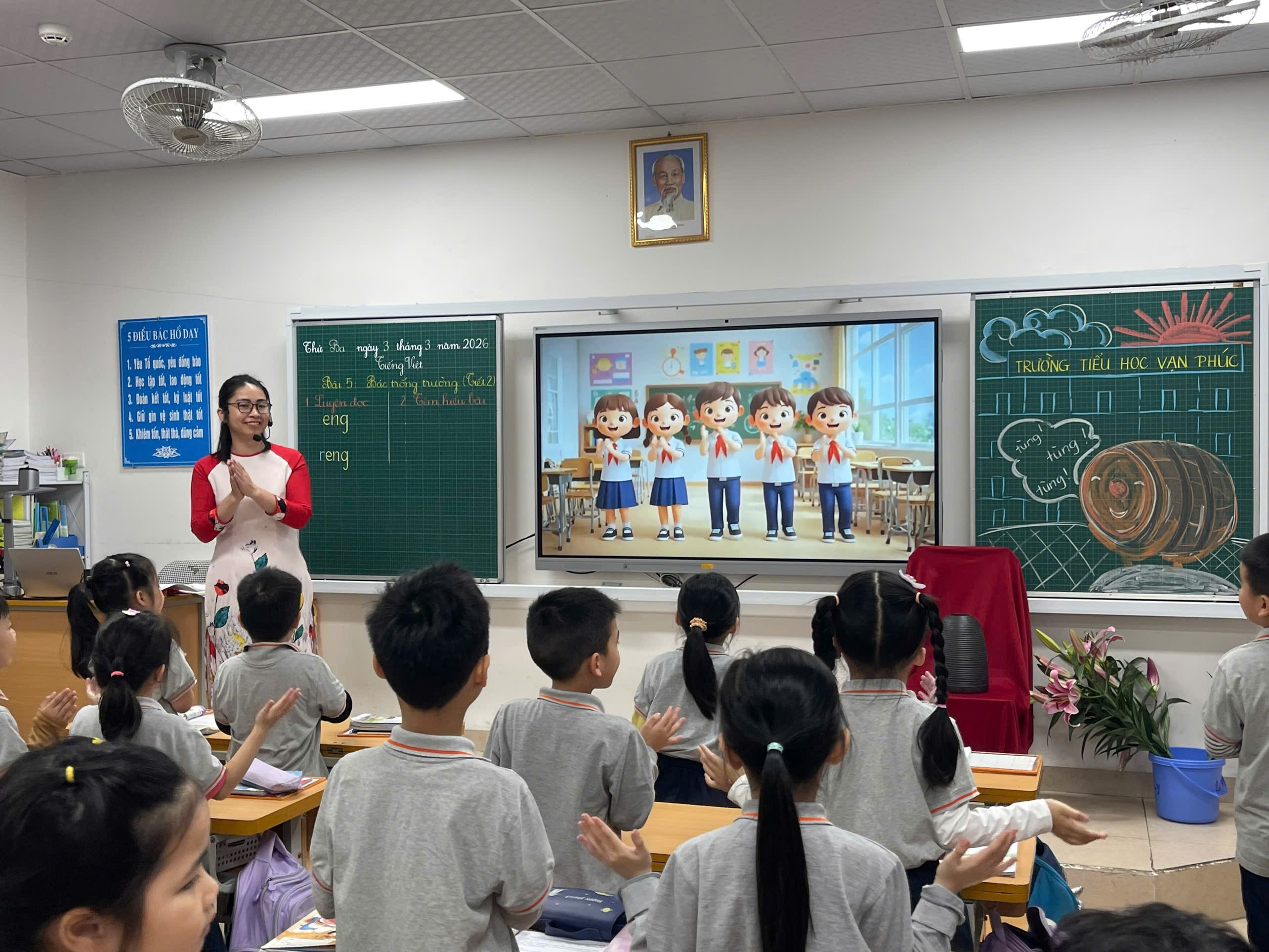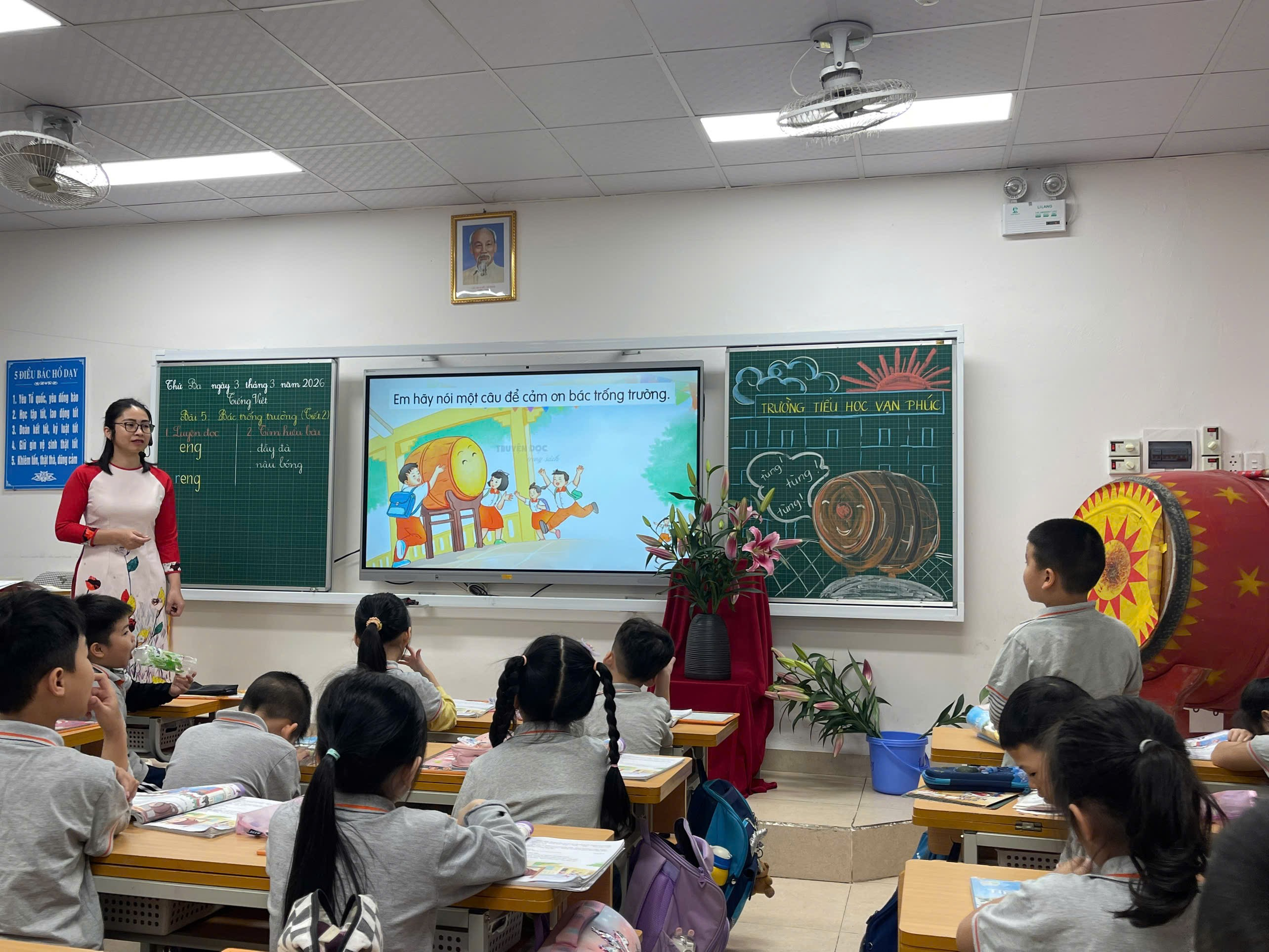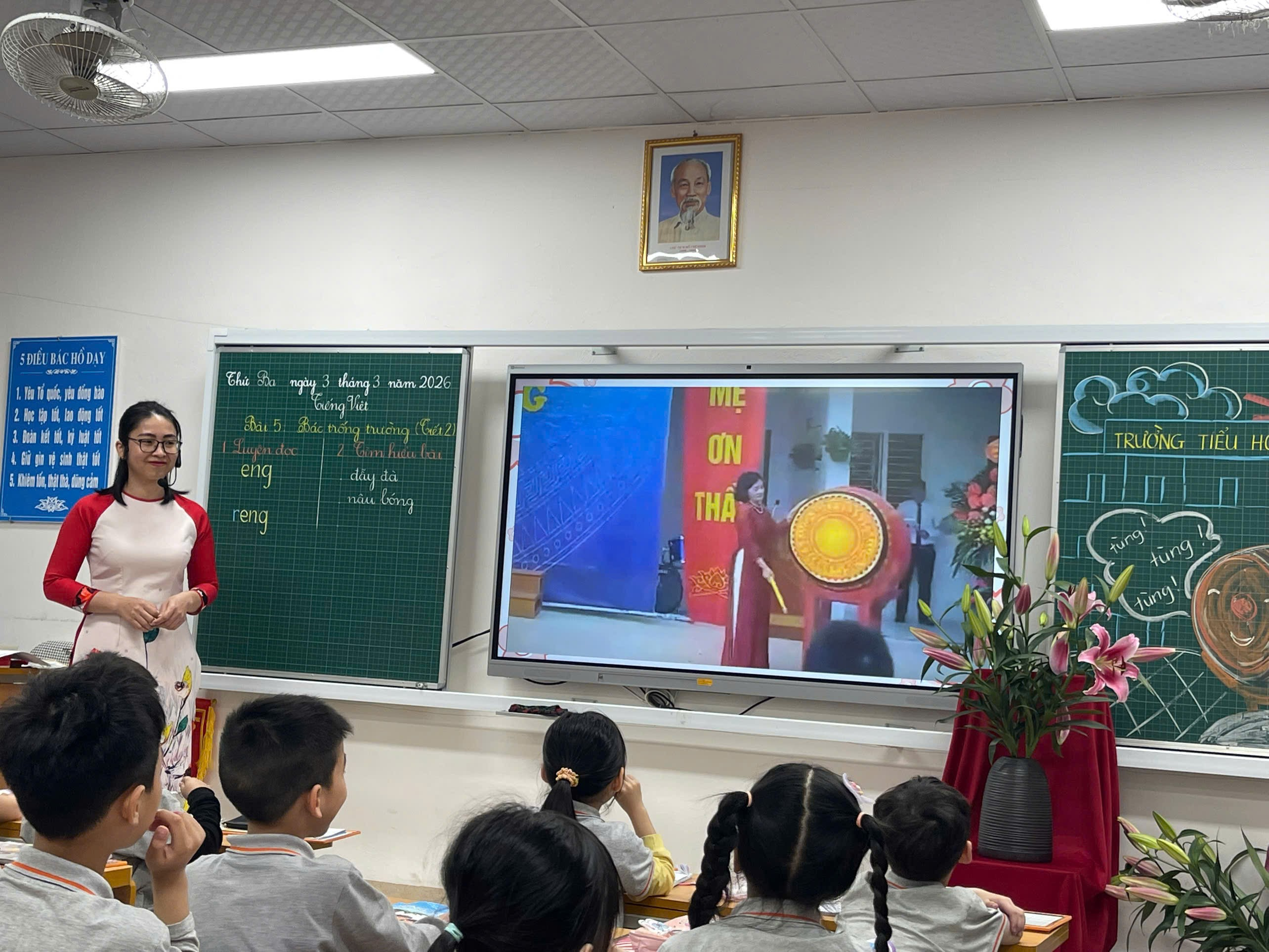 Giữa những ngày tháng Ba rộn ràng thi đua dạy tốt – học tốt, tiết hội giảng Tiếng Việt lớp 1 của cô giáo Lưu Khánh Ly đã để lại nhiều ấn tượng đẹp trong lòng đồng nghiệp. Với bài học “Bác trống trường” (tiết 2), cô không chỉ mang đến một giờ dạy đúng chuẩn mực chuyên môn mà còn thổi vào lớp học những cảm xúc trong trẻo, dịu dàng – đúng với tâm hồn học sinh lớp Một.