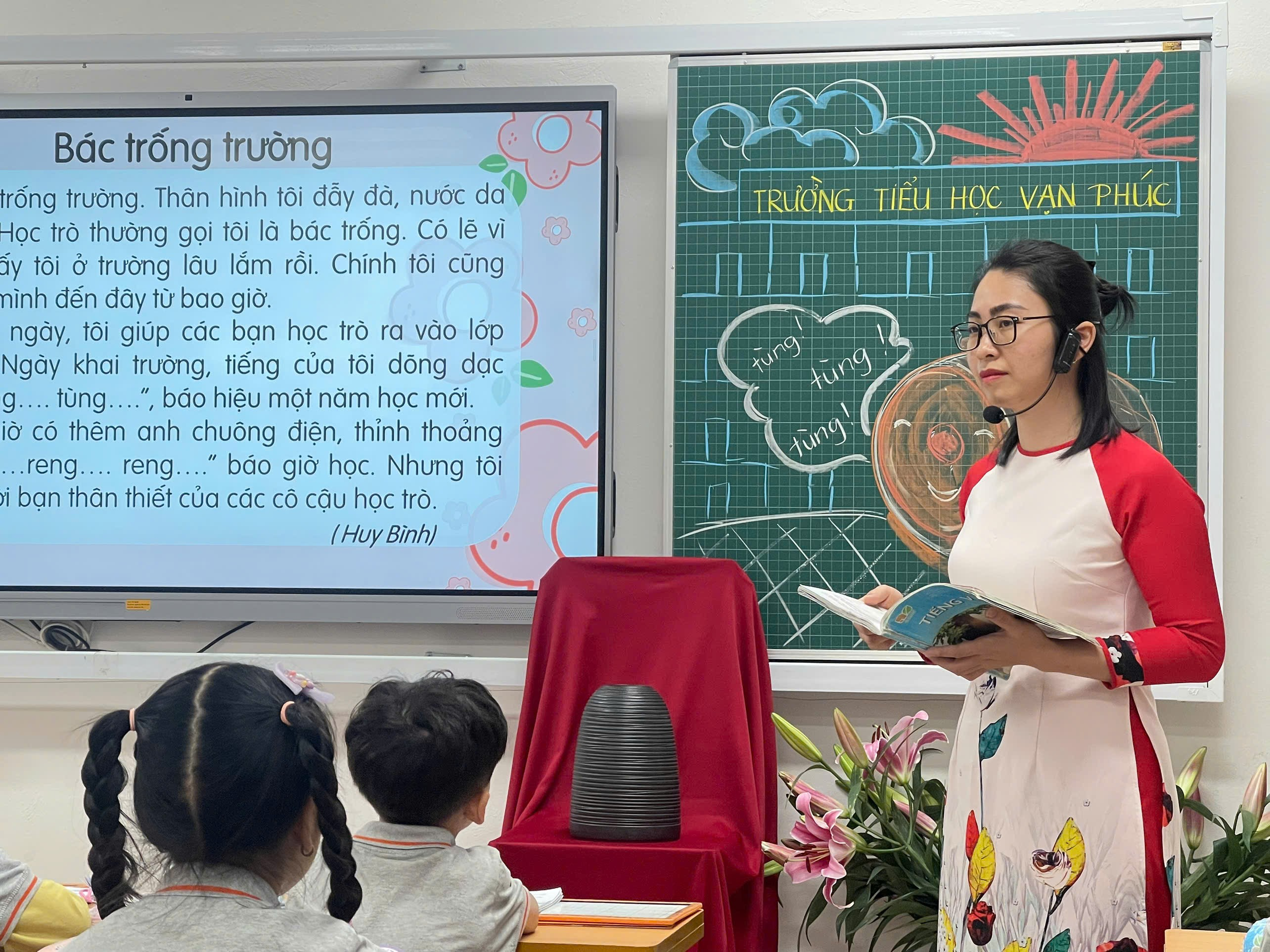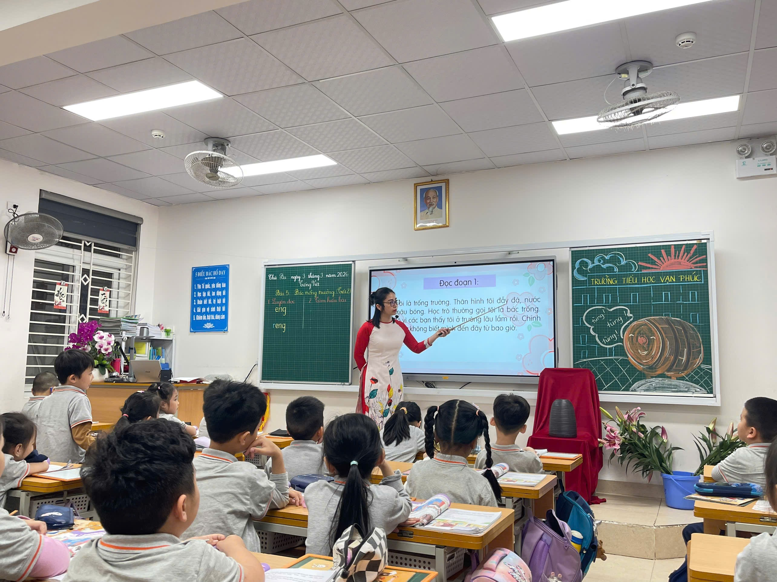Những em còn rụt rè được cô ân cần khích lệ; những em đọc tốt được tuyên dương kịp thời. Cách sửa lỗi phát âm của cô nhỏ nhẹ, tinh tế, giúp các em tự tin hơn sau mỗi lần đọc. Tiếng đọc trong trẻo, đồng thanh của cả lớp vang lên đều đặn, tạo nên nhịp điệu êm ái như chính tiếng “bác trống trường” trong bài.