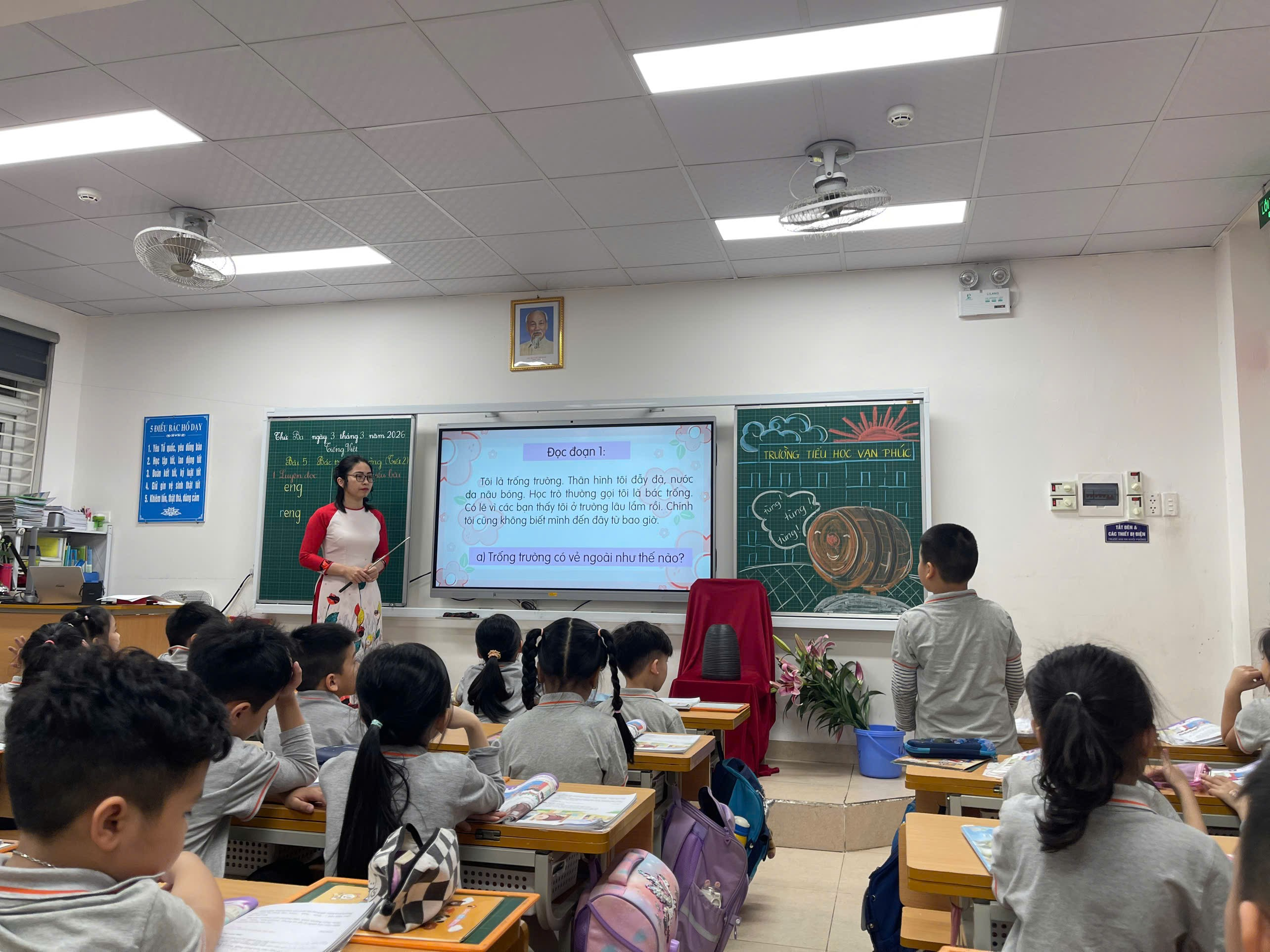 Không dừng lại ở việc đọc đúng, học sinh còn được dẫn dắt để hiểu và cảm nhận nội dung bài. Thông qua hệ thống câu hỏi gợi mở, cô giúp các em nhận ra: tiếng trống trường báo hiệu giờ vào lớp, giờ ra chơi; “bác trống” giống như người bạn thân thiết luôn đồng hành cùng các em mỗi ngày đến trường.
