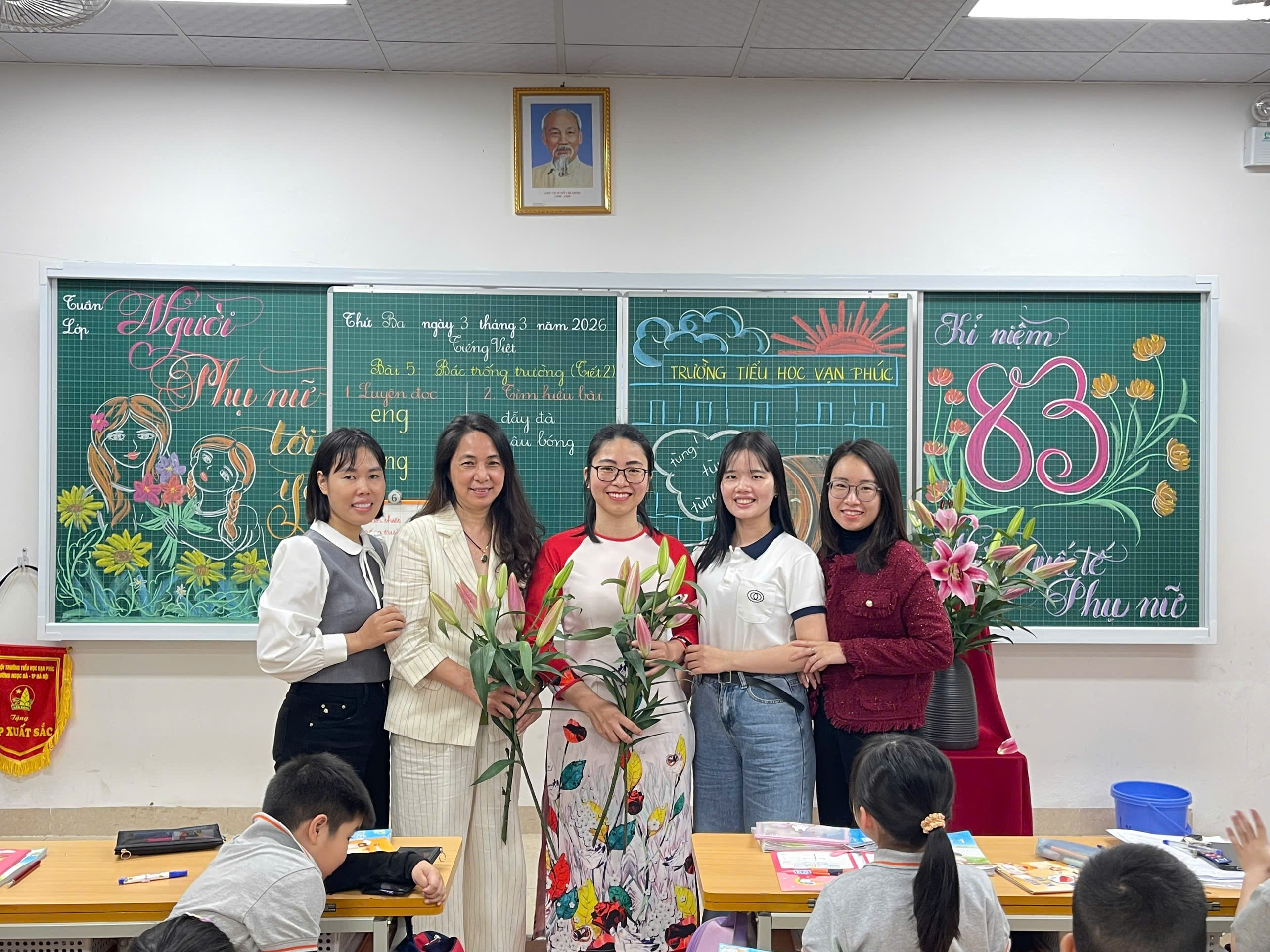 Khép lại tiết học là hoạt động nhỏ nhưng đầy ý nghĩa: các em học sinh đại diện tặng hoa các cô giáo dự giờ. Những bó hoa tươi thắm cùng lời chúc ngây thơ, chân thành đã làm không khí lớp học thêm ấm áp.