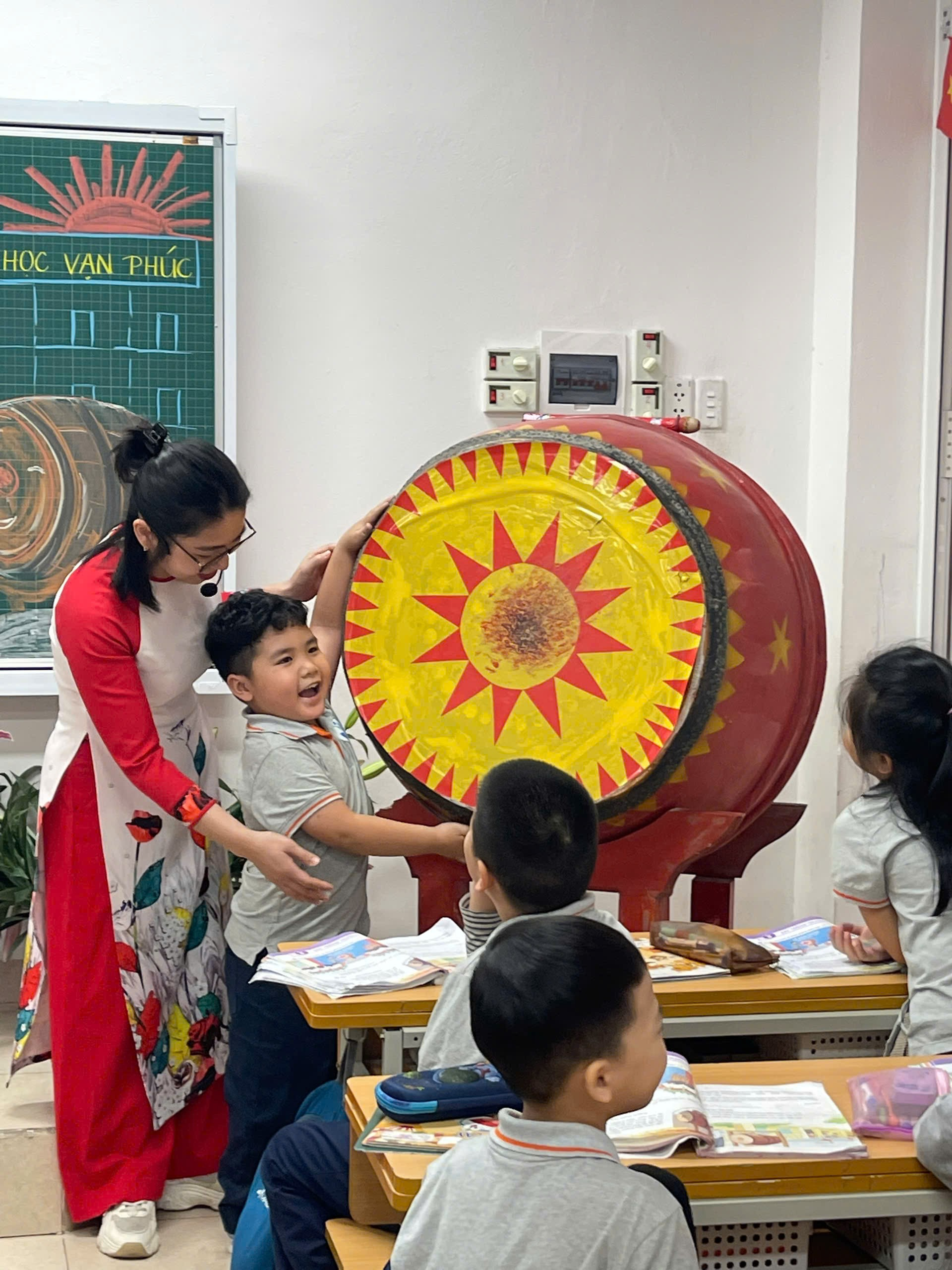Những câu trả lời hồn nhiên: “Con thích nghe tiếng trống vì được ra chơi”, “Tiếng trống gọi chúng con vào lớp học” khiến không khí lớp học thêm sinh động. Từ đó, bài học được mở rộng sang giáo dục ý thức giữ gìn tài sản chung, yêu quý ngôi trường của mình.