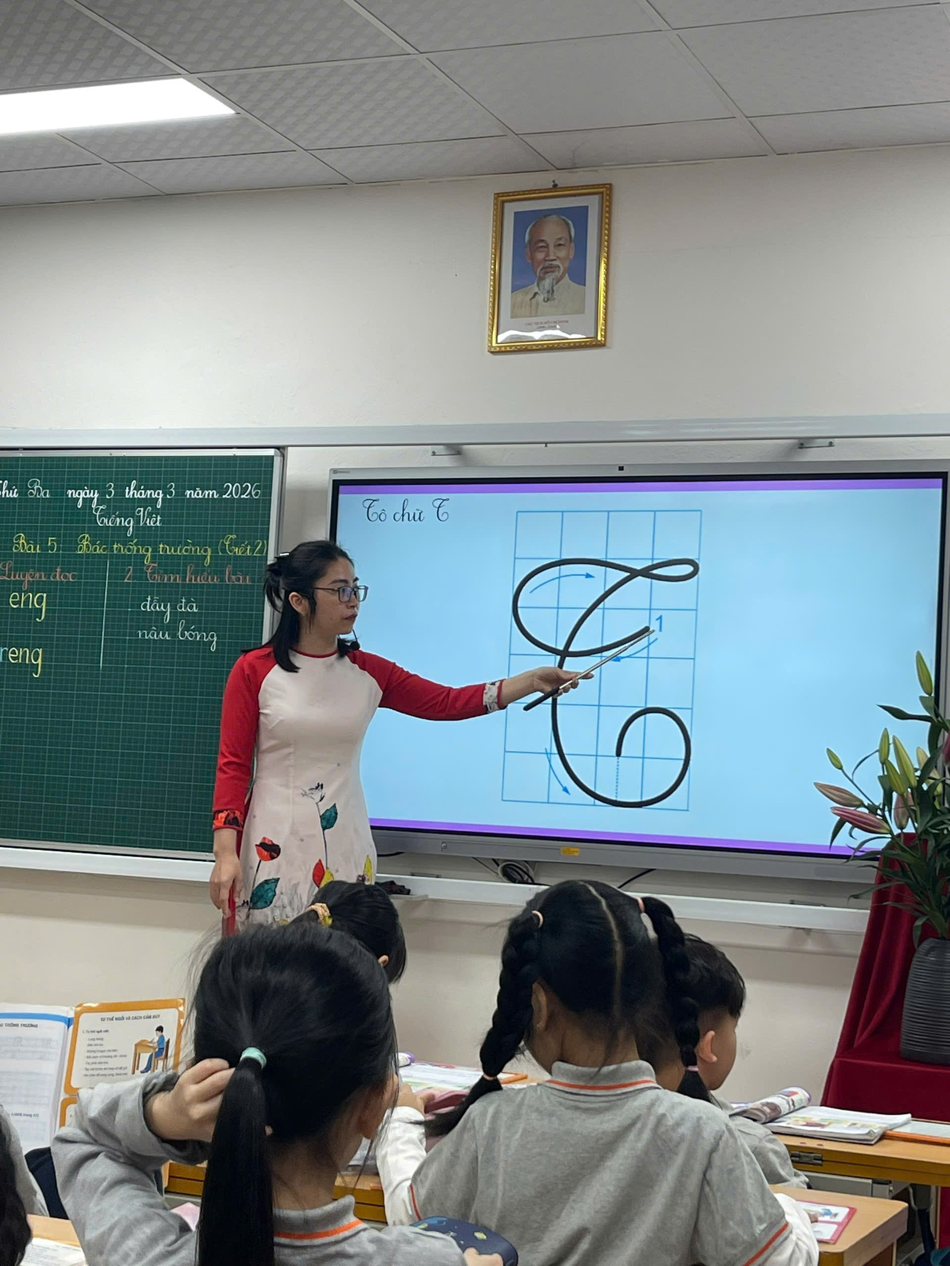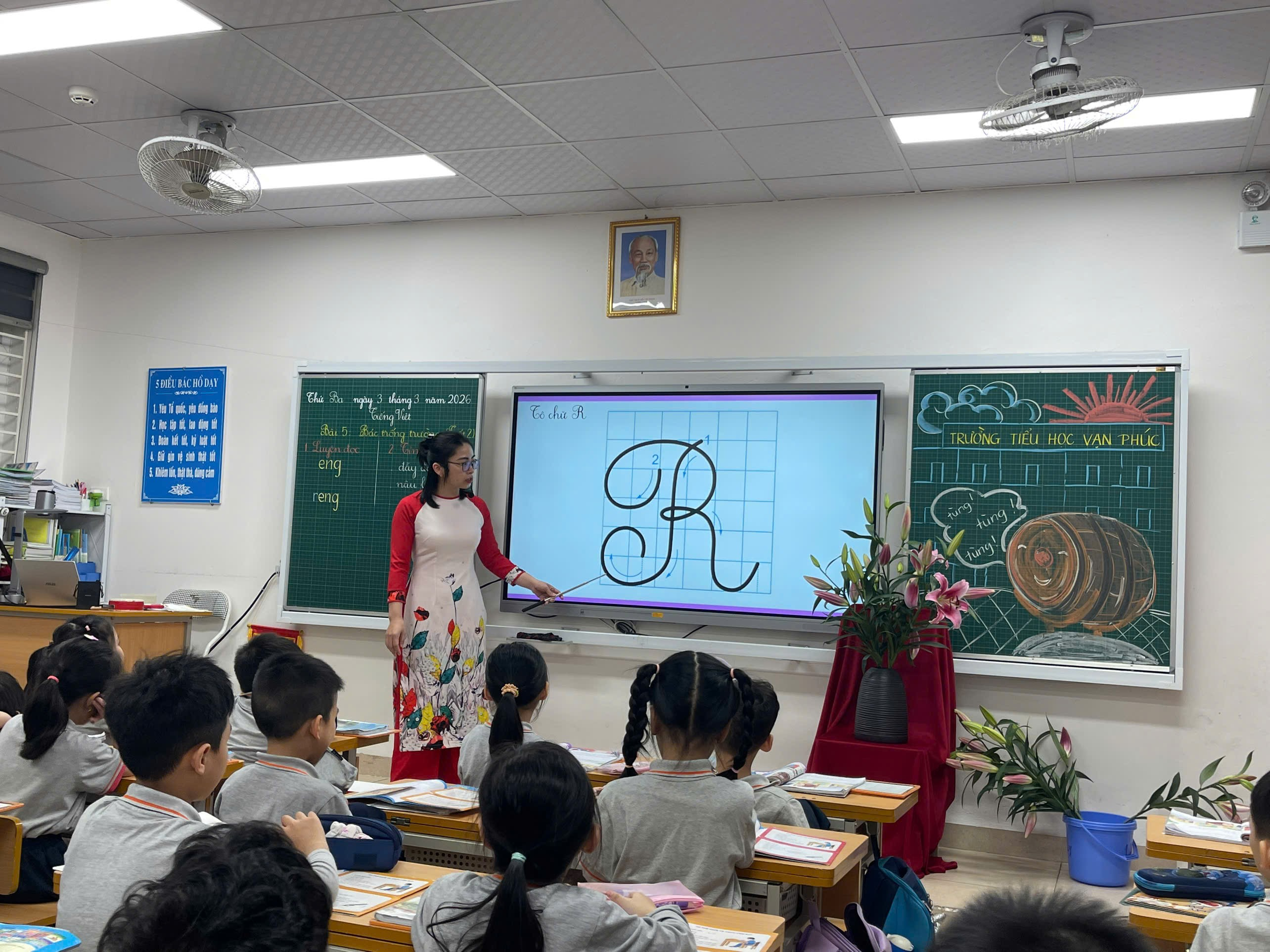 Một điểm nhấn quan trọng của tiết học là hoạt động luyện viết chữ hoa TR. Cô giáo hướng dẫn tỉ mỉ từng nét chữ: điểm đặt bút, độ cao, cách lia bút và dừng bút. Học sinh chăm chú quan sát, luyện viết trên bảng con rồi viết vào vở.