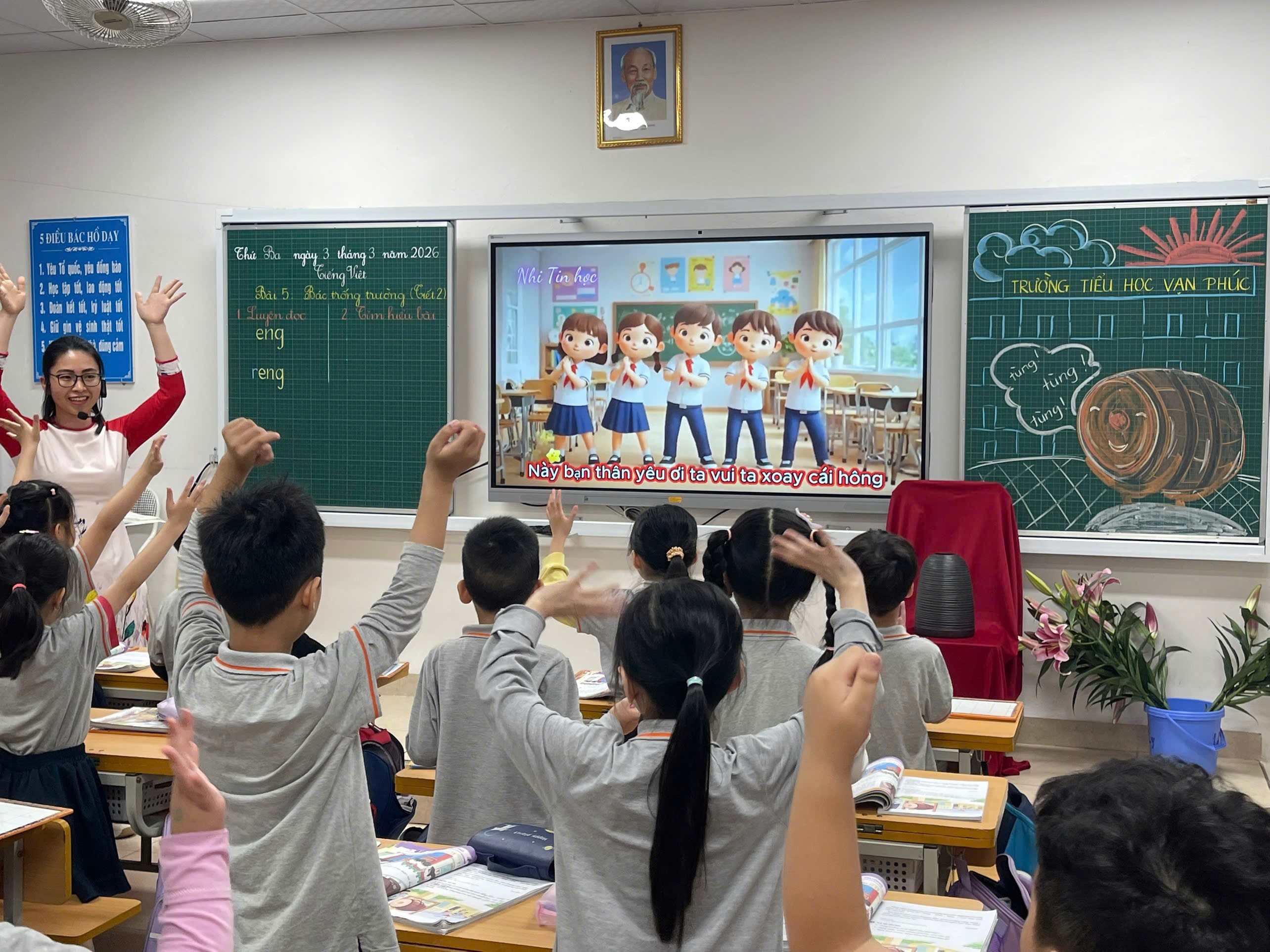 Hoạt động khởi động không chỉ giúp các em thư giãn, giải phóng năng lượng mà còn tạo tâm thế tích cực, sẵn sàng bước vào bài học mới. Từ sự sôi nổi ấy, cô giáo Lưu Khánh Ly khéo léo dẫn dắt học sinh trở về với những thanh âm quen thuộc của mái trường – tiếng trống vang lên mỗi ngày – để mở ra nội dung bài “Bác trống trường” một cách tự nhiên, liền mạch.