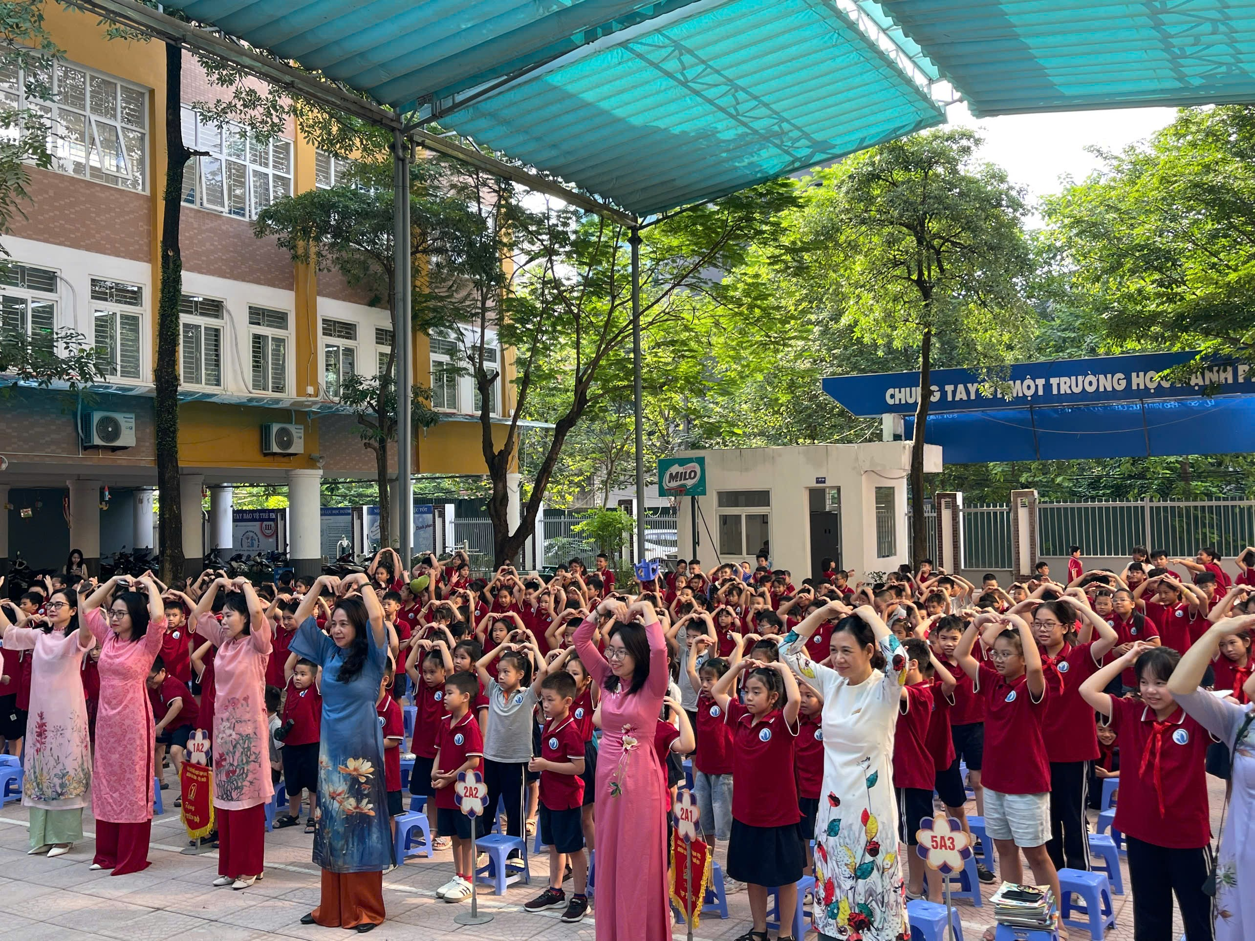 Hàng trăm “thiên thần nhỏ” cùng hòa nhịp trong màn đồng diễn ca khúc “Thiên thần ở khắp mọi nơi”, lan tỏa năng lượng tích cực khắp sân trường.