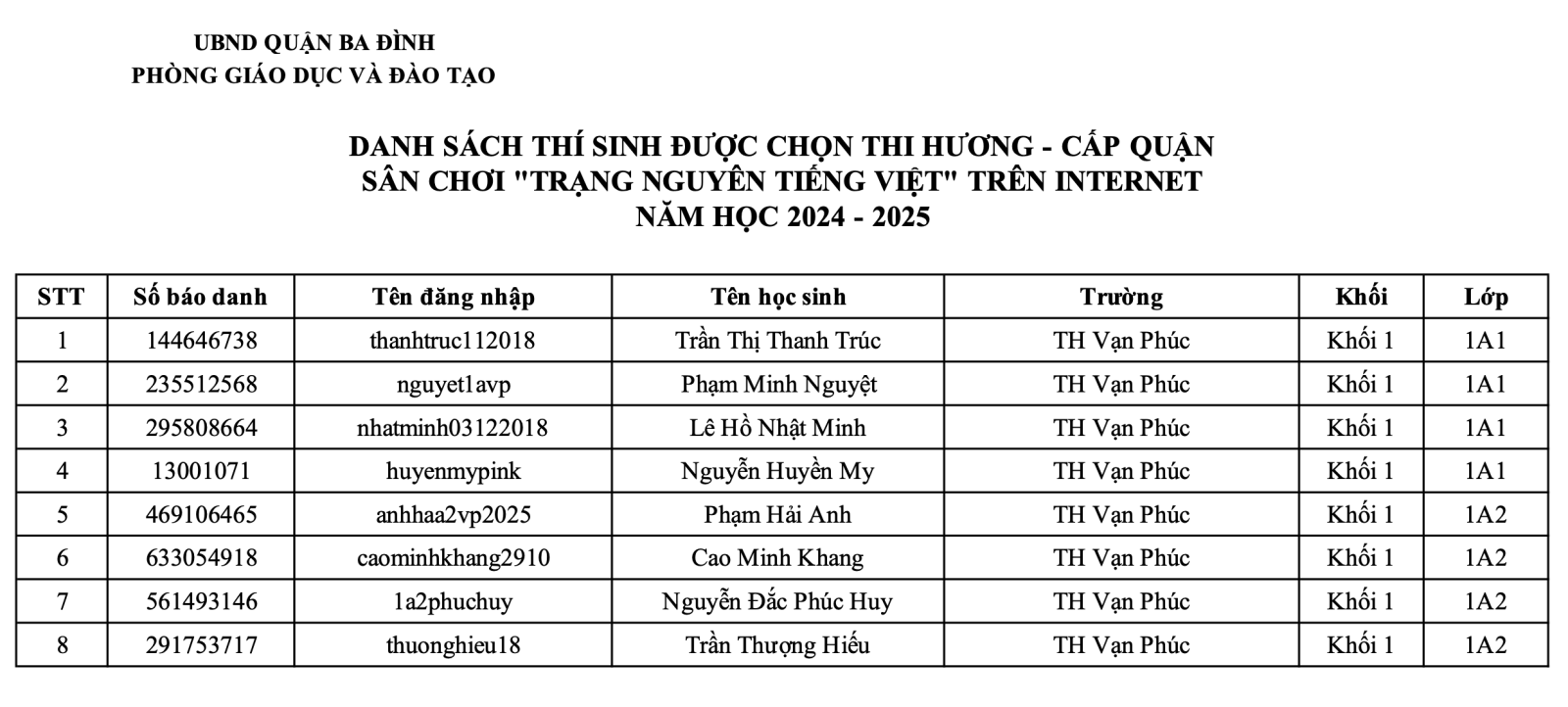 Thông báo danh sách học sinh khối 1 tham dự vòng thi Hương - cấp Quận sân chơi TNTV năm học 2024-2025