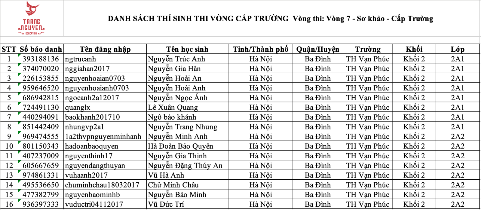 Dưới đây là Danh sách học sinh khối 2 đủ điều kiện tham gia Vòng thi Sơ khảo cấp Trường sân chơi Trạng Nguyên Tiếng Việt trên Internet năm học 2024-2025 do Phòng Giáo dục và Ban tổ chức cuộc thi Trạng Nguyên Tiếng Việt lựa chọn.
