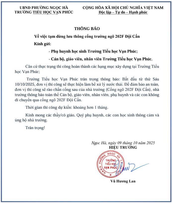 THÔNG BÁO: Về việc tạm dừng lưu thông cổng trường ngõ 202F Đội Cấn