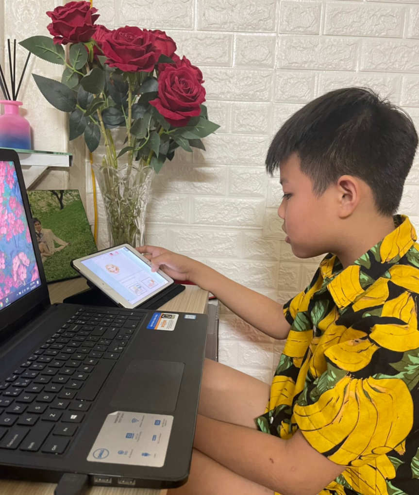 Các con học sinh tích cực, say sưa với những câu hỏi Tiếng Anh và thật hứng thú với một bài thi theo hình thức trực tuyến