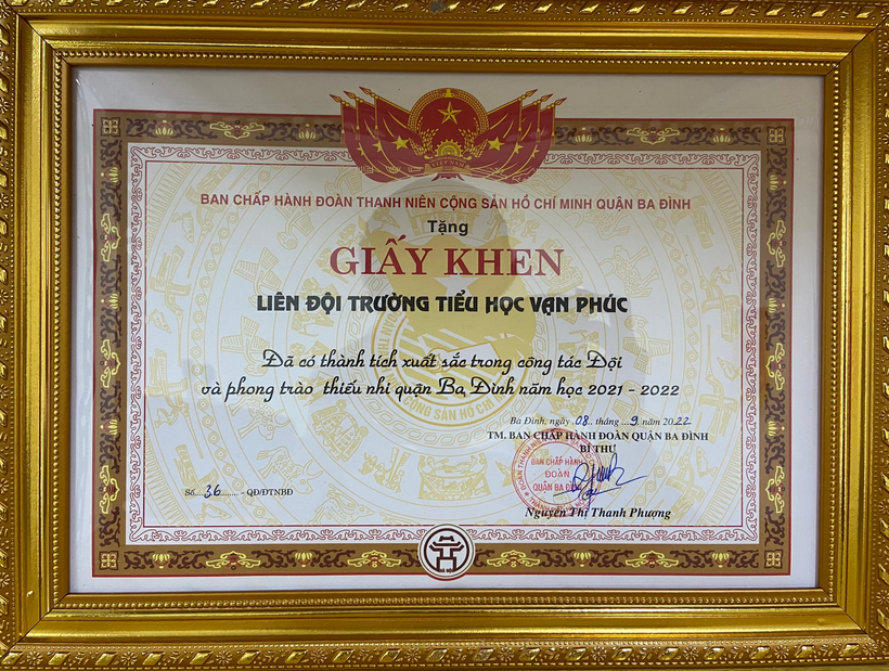 Tới tham dự chương trình, Liên đội Trường Tiểu học Vạn Phúc đã vinh dự nhận giấy khen của Ban chấp hành Đoàn TNCS Hồ Chí Minh quận Ba Đình với những thành tích xuất sắc trong công tác Đội và phong trào thiếu nhi năm học 2021-2022.