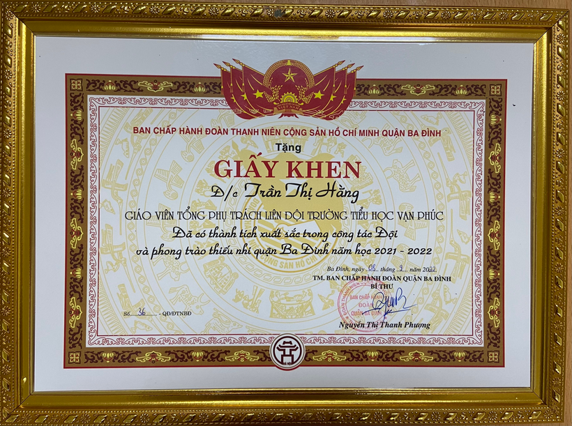 Cô giáo Trần Thị Hằng - Giáo viên làm Tổng phụ trách Đội cũng đã vinh dự nhận giấy khen của Quận đoàn Ba Đình "Đã có thành tích xuất sắc trong công tác Đội và phong trào thiếu nhi năm học 2021 - 2022".