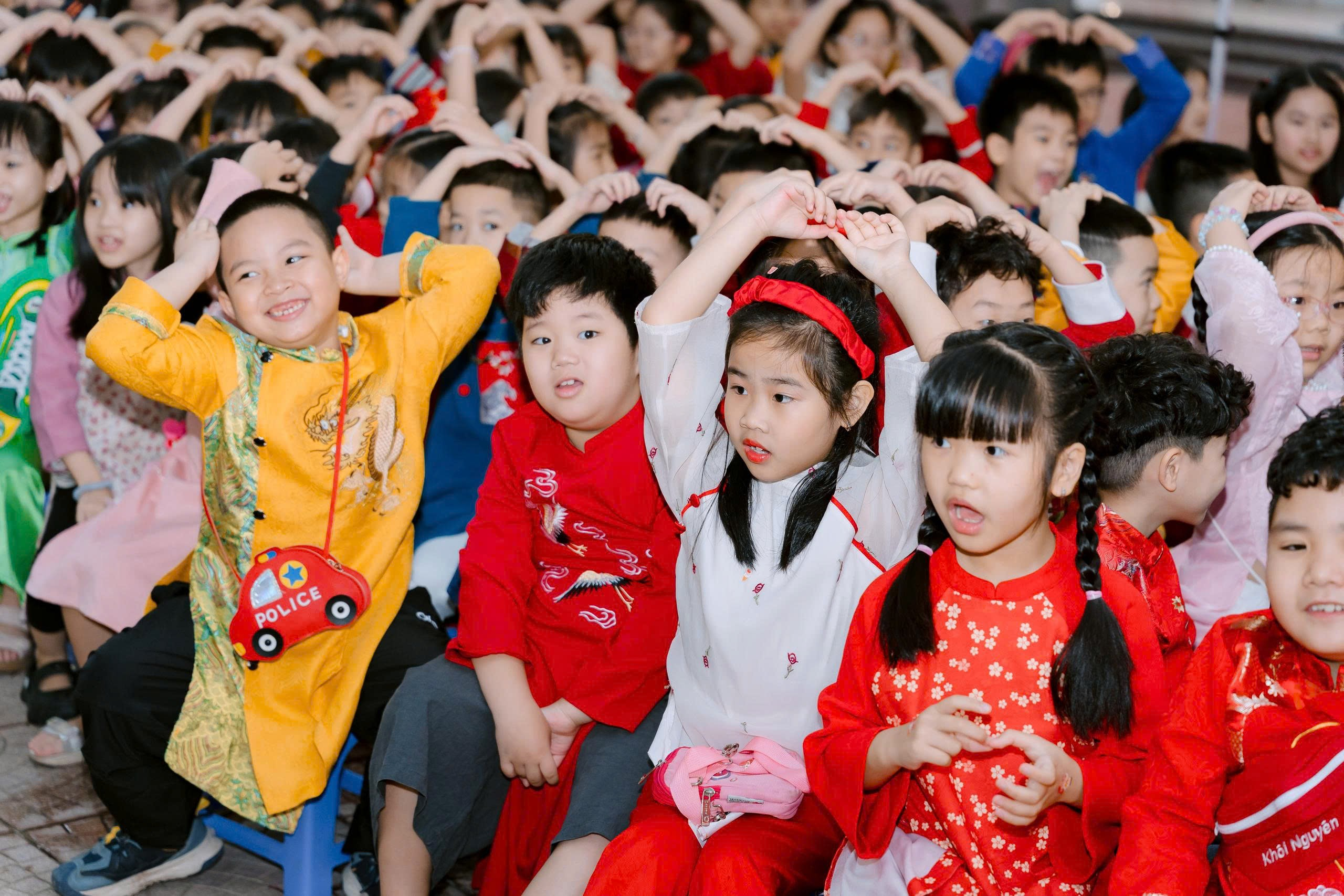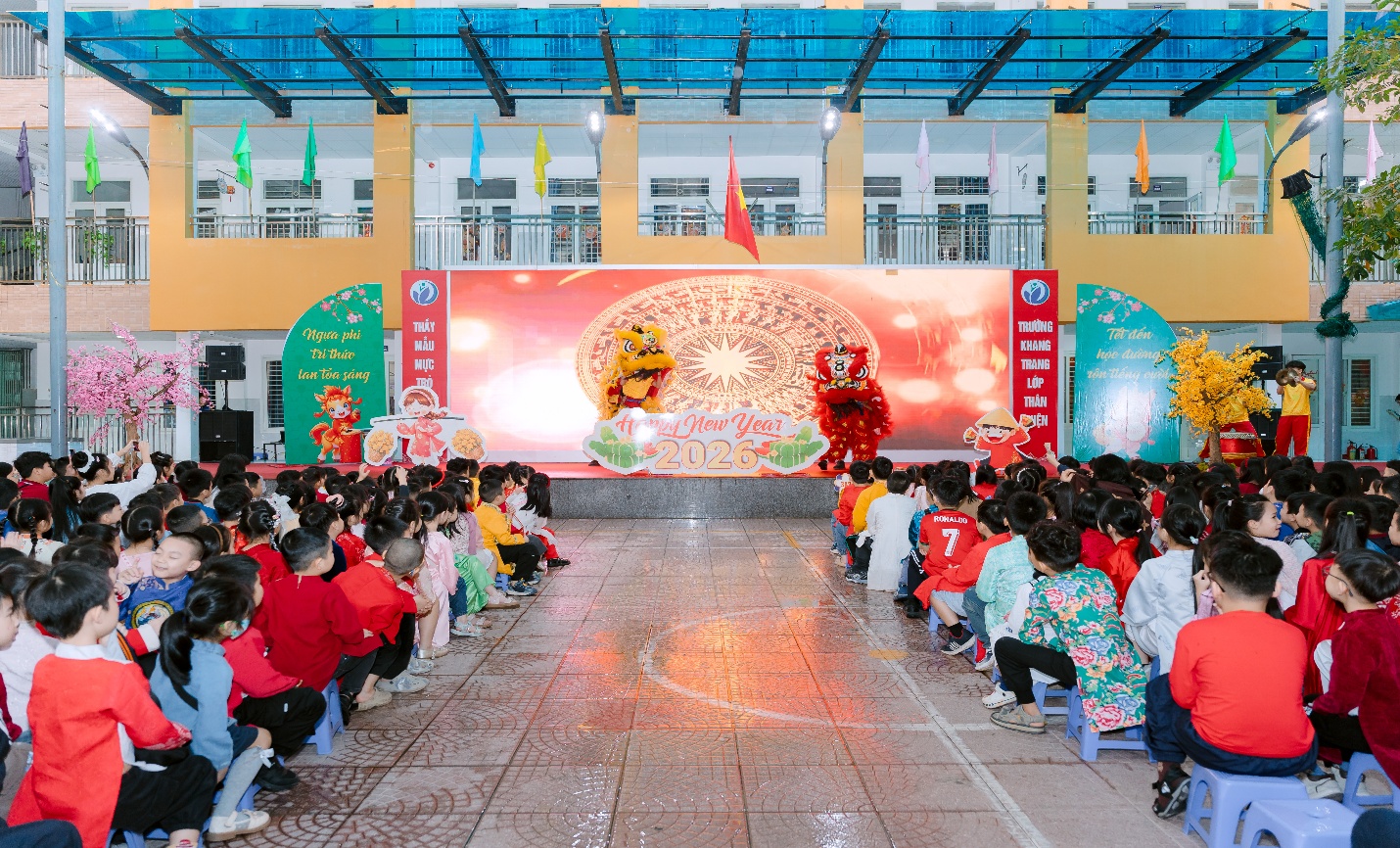 Mở đầu chương trình là tiếng trống lân vang dội, rộn ràng khắp sân trường. Những bước nhảy uyển chuyển, những màn nhào lộn điêu luyện của đội lân – rồng khiến các bạn nhỏ 1A2 không khỏi reo lên thích thú. Ánh mắt tròn xoe, nụ cười rạng rỡ – đó là khoảnh khắc mùa xuân thực sự chạm đến trái tim các em.