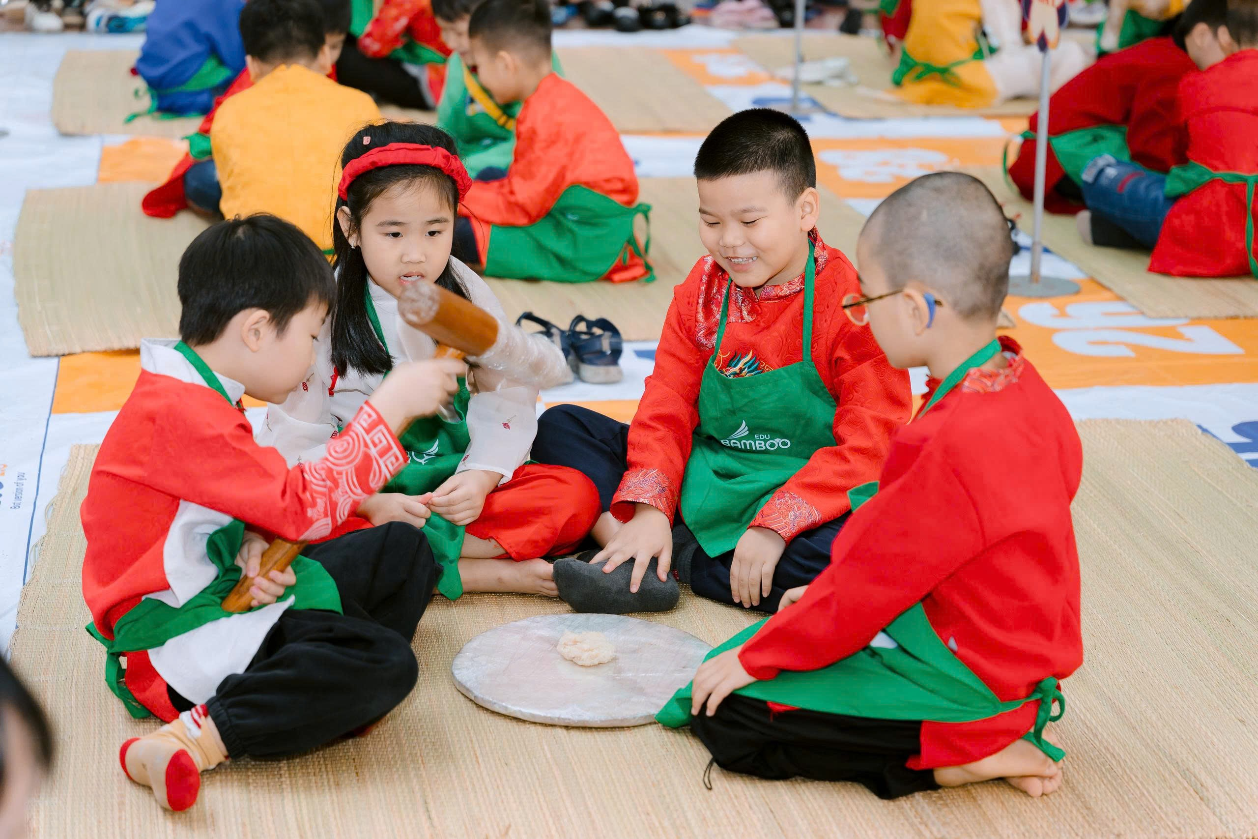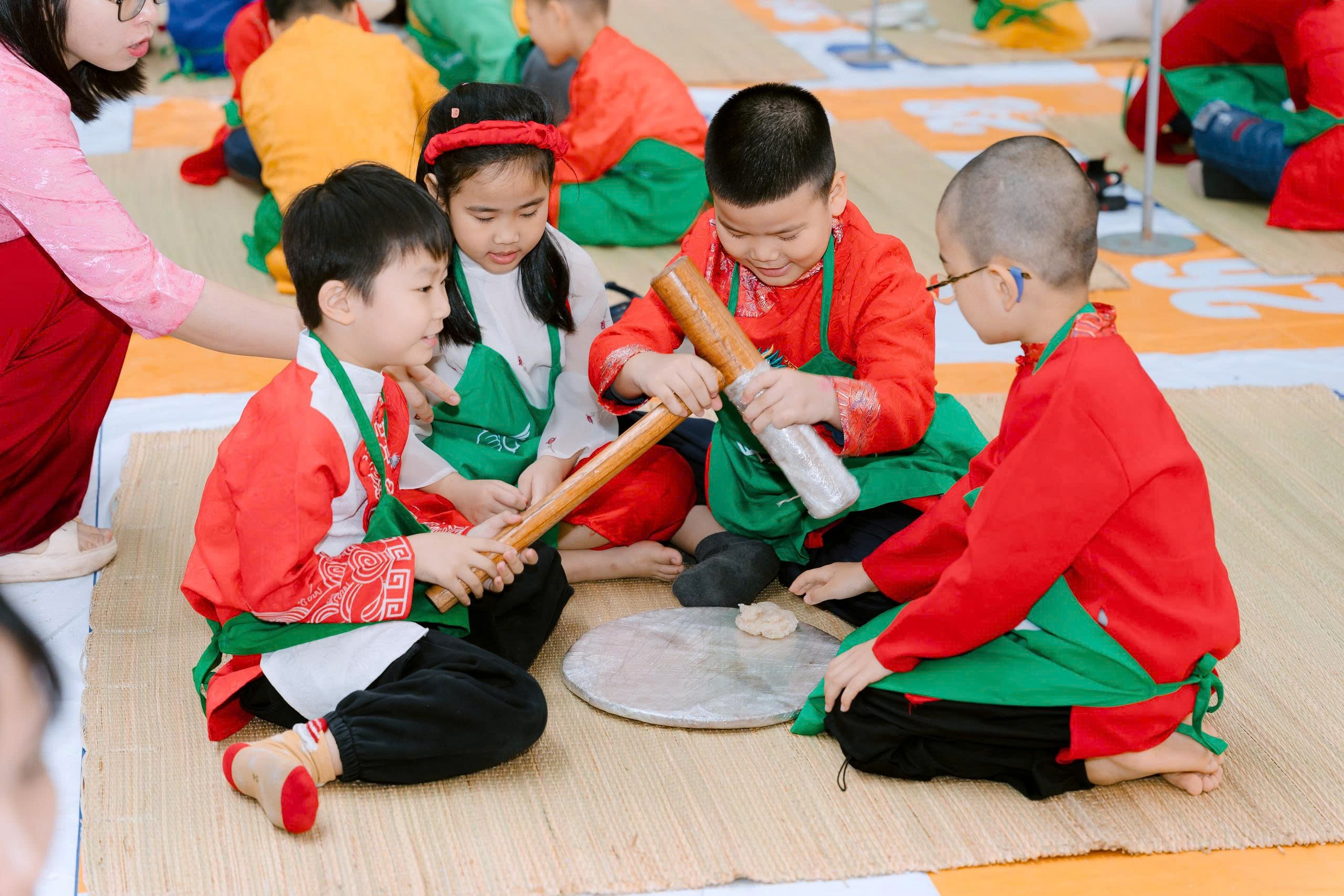 Rời khu vực sân khấu chính, các bạn nhỏ tiếp tục hành trình trải nghiệm tại các gian hàng truyền thống. Ở khu vực giã bánh giày, dưới sự hướng dẫn của thầy cô và phụ huynh, những cánh tay nhỏ xinh thay nhau cầm chày giã xôi trong tiếng hò reo cổ vũ. Qua hoạt động này, các em không chỉ hiểu thêm về món ăn truyền thống mà còn cảm nhận được sự gắn kết và tinh thần sẻ chia.