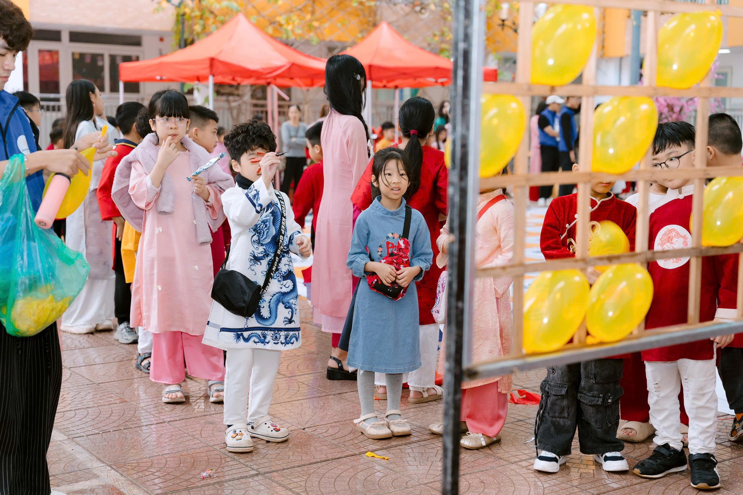 Không gian trở nên trầm lắng và đầy chất xuân tại gian hàng viết Thư pháp. Lần đầu tiên được cầm bút lông, chấm mực tàu và nắn nót từng nét chữ trên nền giấy đỏ, các em say mê quan sát và thử sức viết những chữ giản dị như “Học”, “Chăm”, “Ngoan”. Mỗi nét chữ tuy còn vụng về nhưng chứa đựng ước mong về một năm học tiến bộ và nhiều niềm vui.