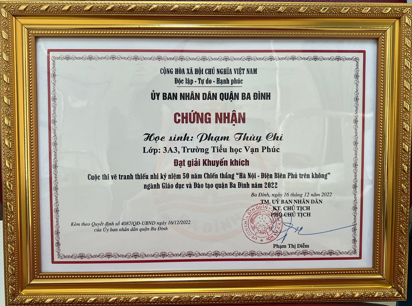 Em Phạm Thùy Chi - lớp 3A3 đạt giải Khuyến Khích cấp quận cuộc thi vẽ tranh với chủ đề “Hà Nội - Điện Biên Phủ trên không”