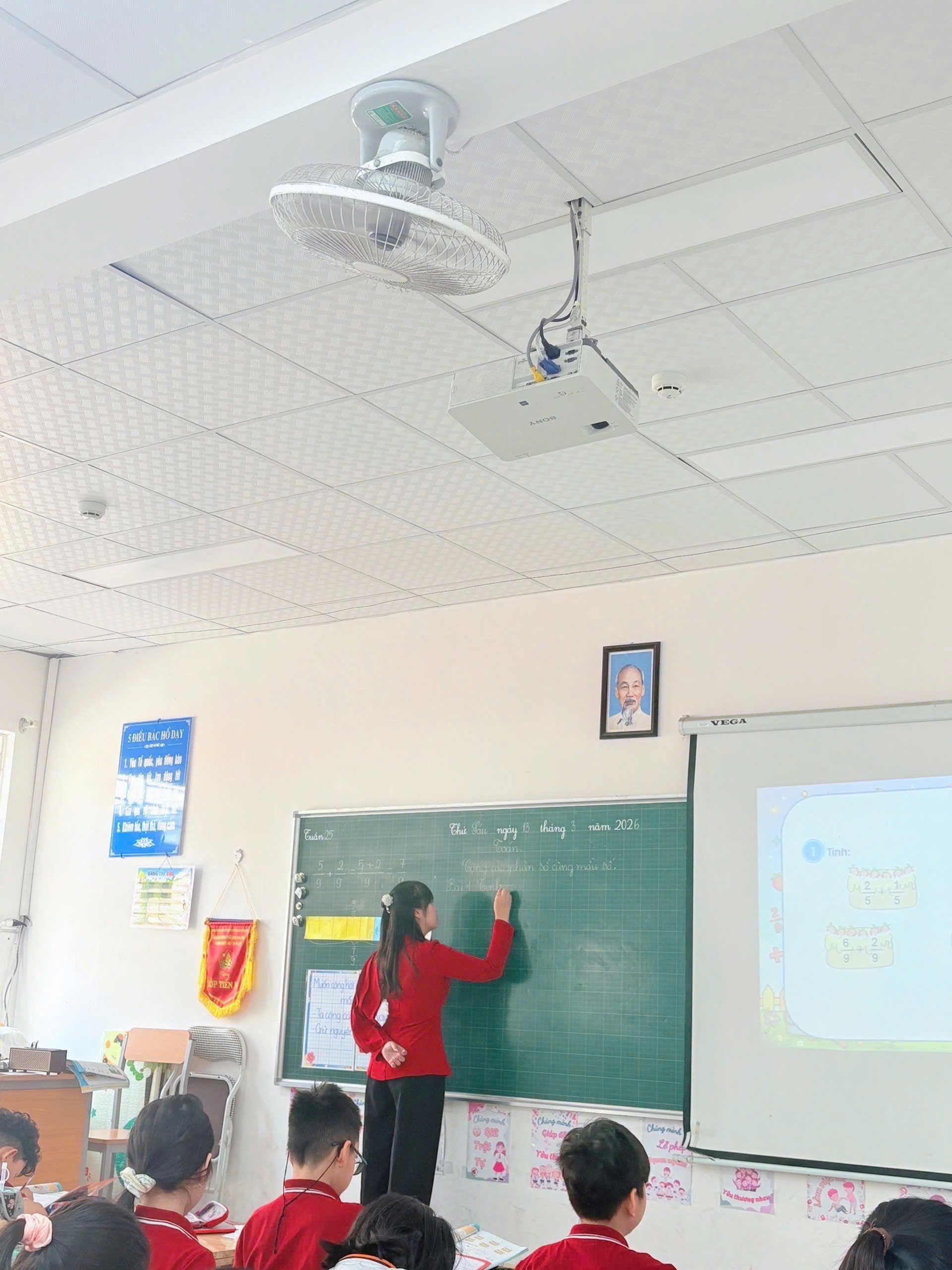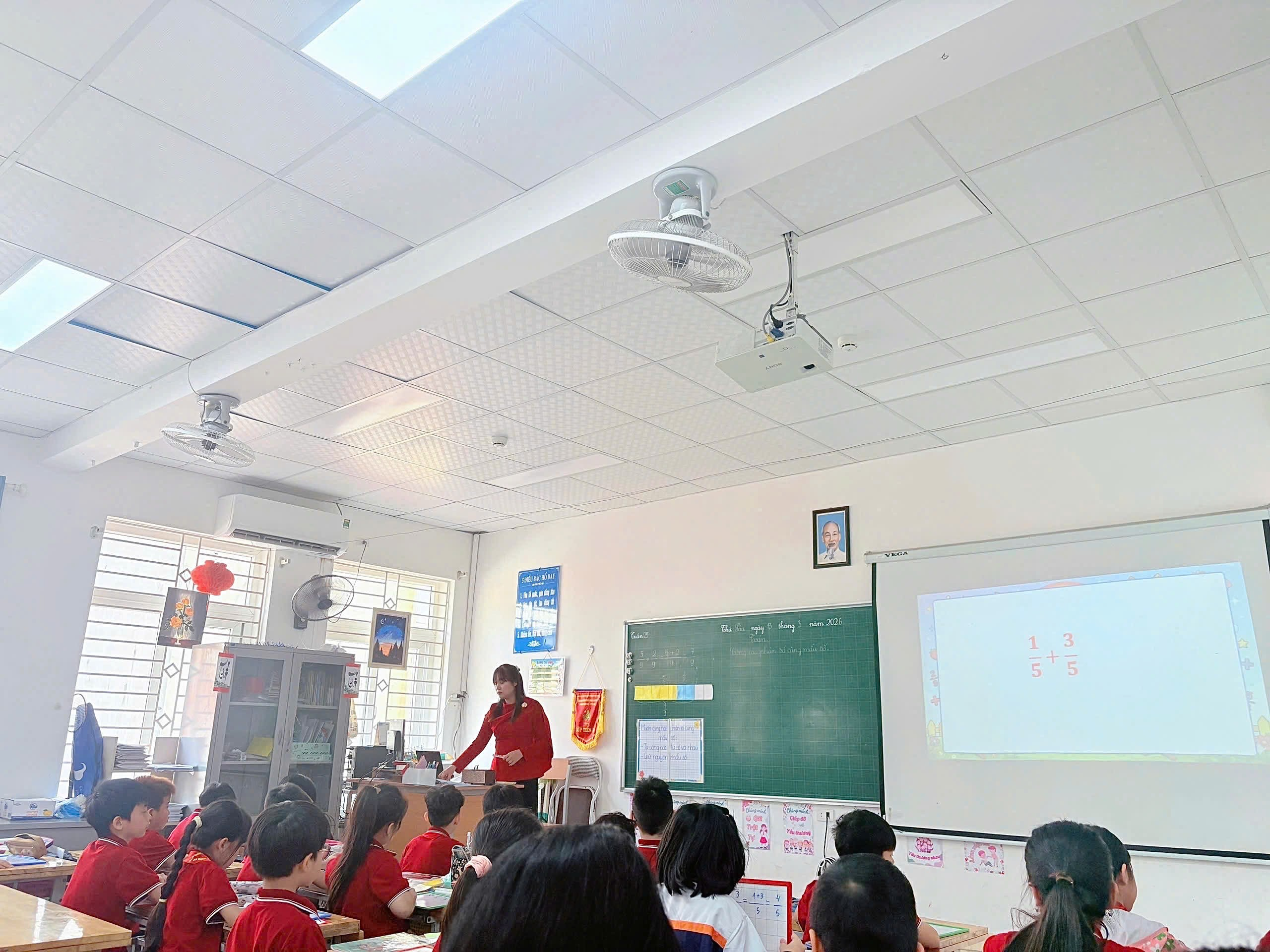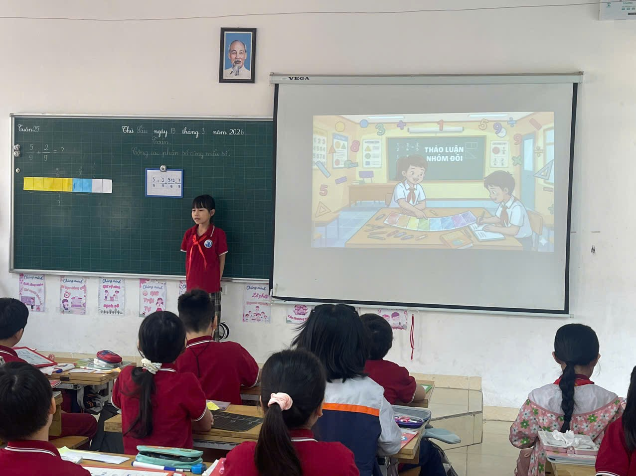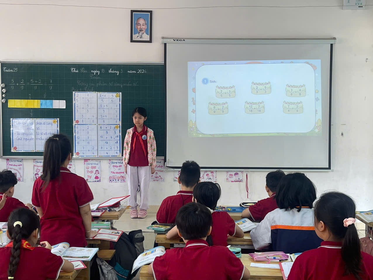 Bước vào bài học mới, học sinh được khuyến khích tự tin lên bảng trình bày cách làm của mình. Các em mạnh dạn chia sẻ suy nghĩ, cách giải và cùng nhau nhận xét, bổ sung dưới sự hướng dẫn, gợi mở của cô giáo. Qua quá trình trao đổi và thảo luận, học sinh từng bước rút ra được quy tắc cộng các phân số cùng mẫu số, từ đó hiểu bài sâu hơn và phát triển khả năng tư duy toán học.