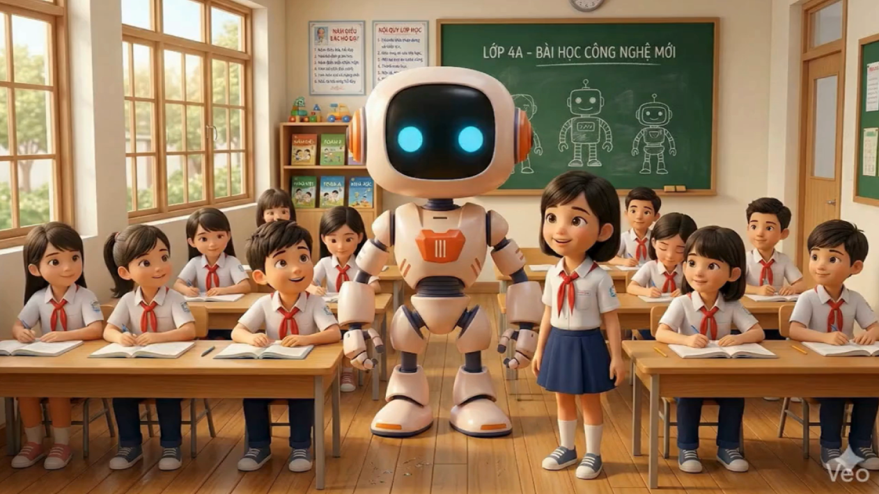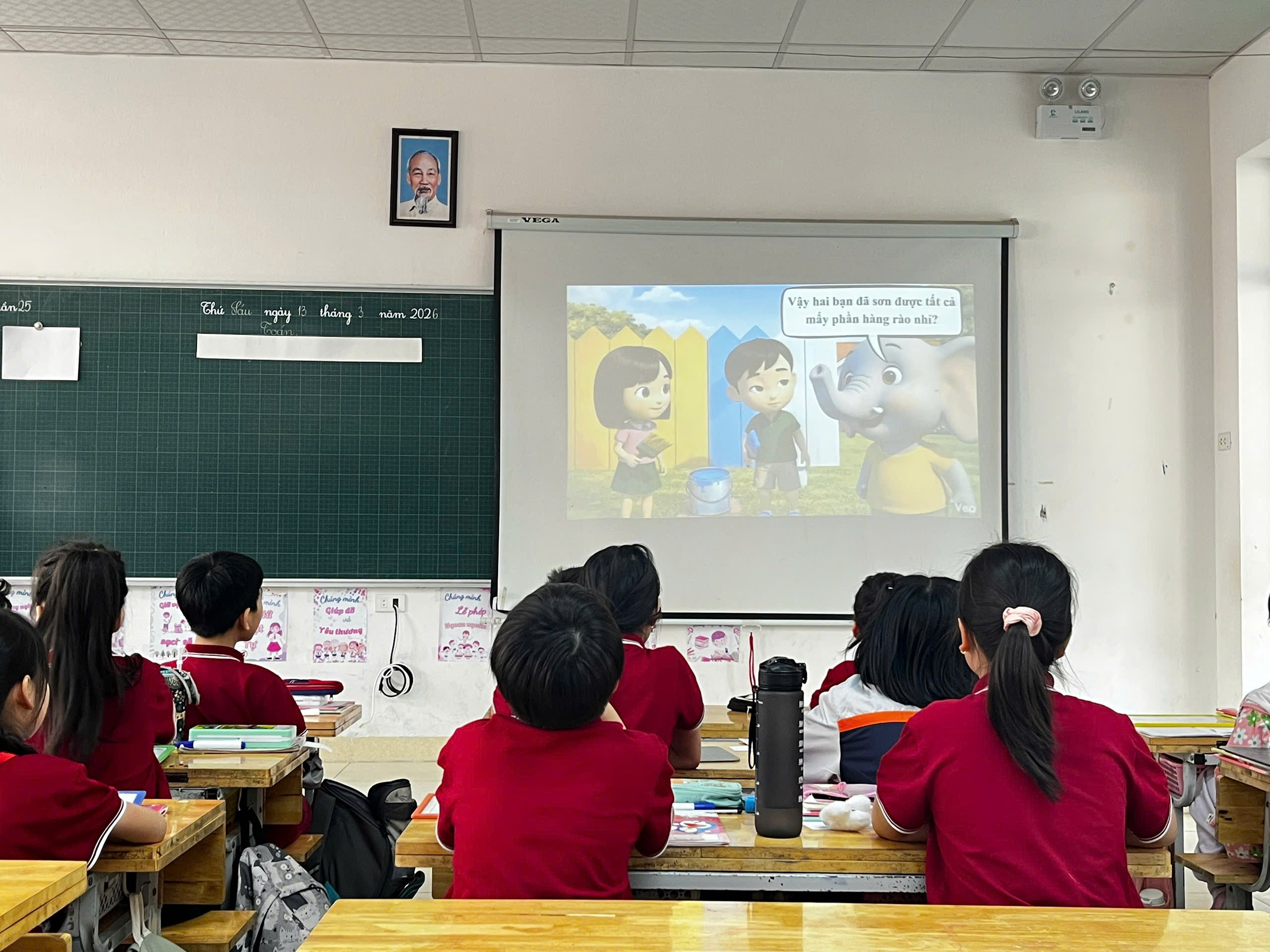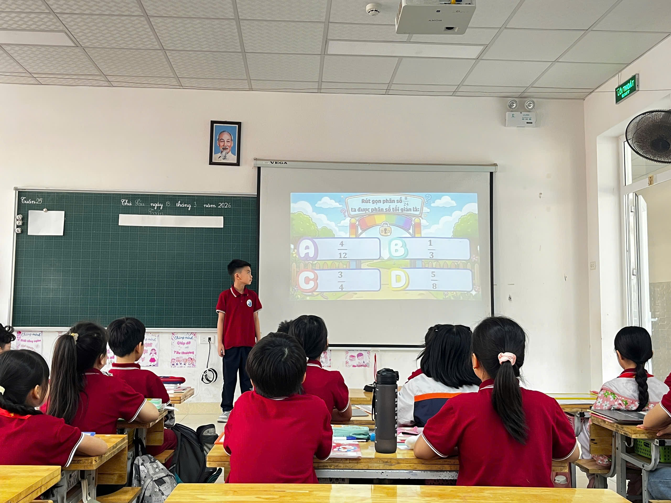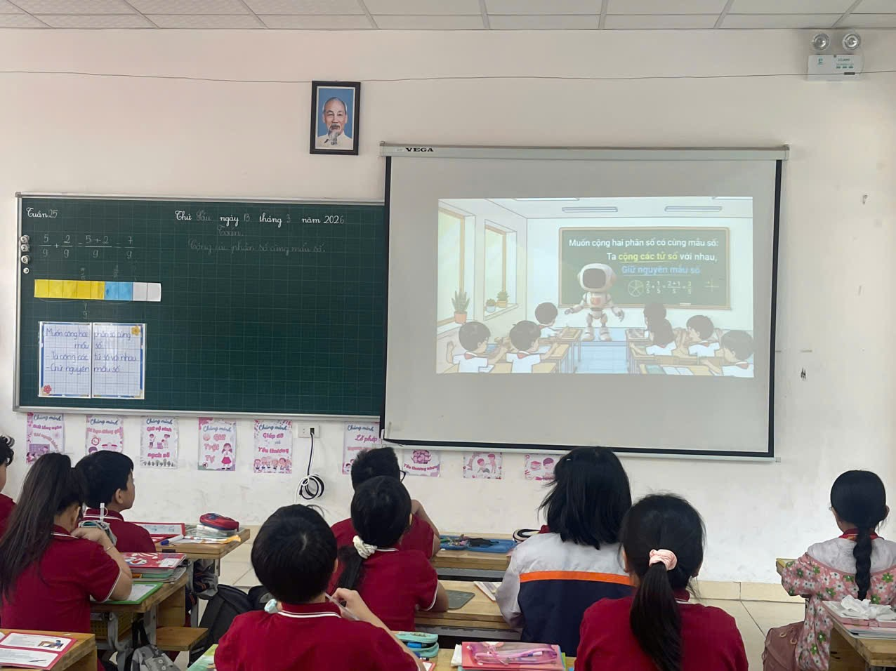 Một điểm nhấn đặc biệt của tiết hội giảng là việc ứng dụng công nghệ AI trong dạy học. Nhân vật đồng hành Robotmath xuất hiện như một người bạn nhỏ thân thiện, dẫn dắt học sinh khám phá nội dung bài học thông qua video minh họa sinh động. Sự kết hợp giữa công nghệ và phương pháp dạy học tích cực đã giúp bài học trở nên gần gũi, hấp dẫn, khơi dậy sự tò mò và hứng thú học tập của học sinh.