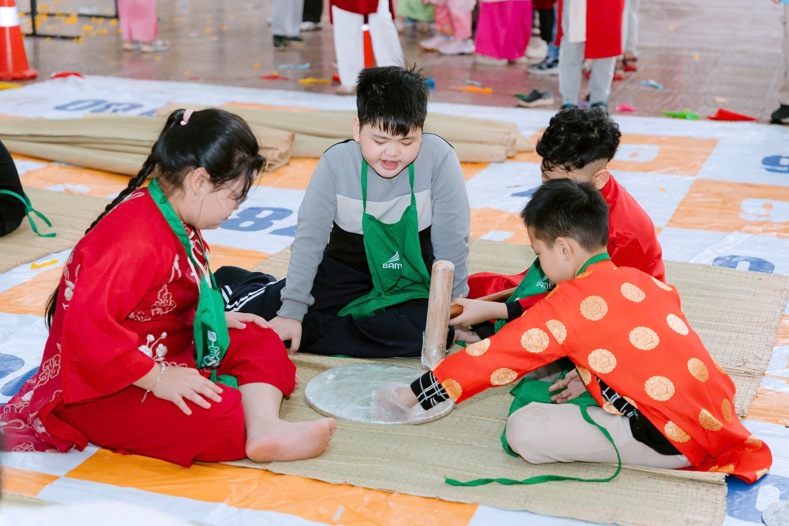 Tiếng chày vang lên nhịp nhàng giữa tiếng cười rộn rã, tạo nên khung cảnh đậm chất truyền thống giữa không gian hiện đại của sân trường.